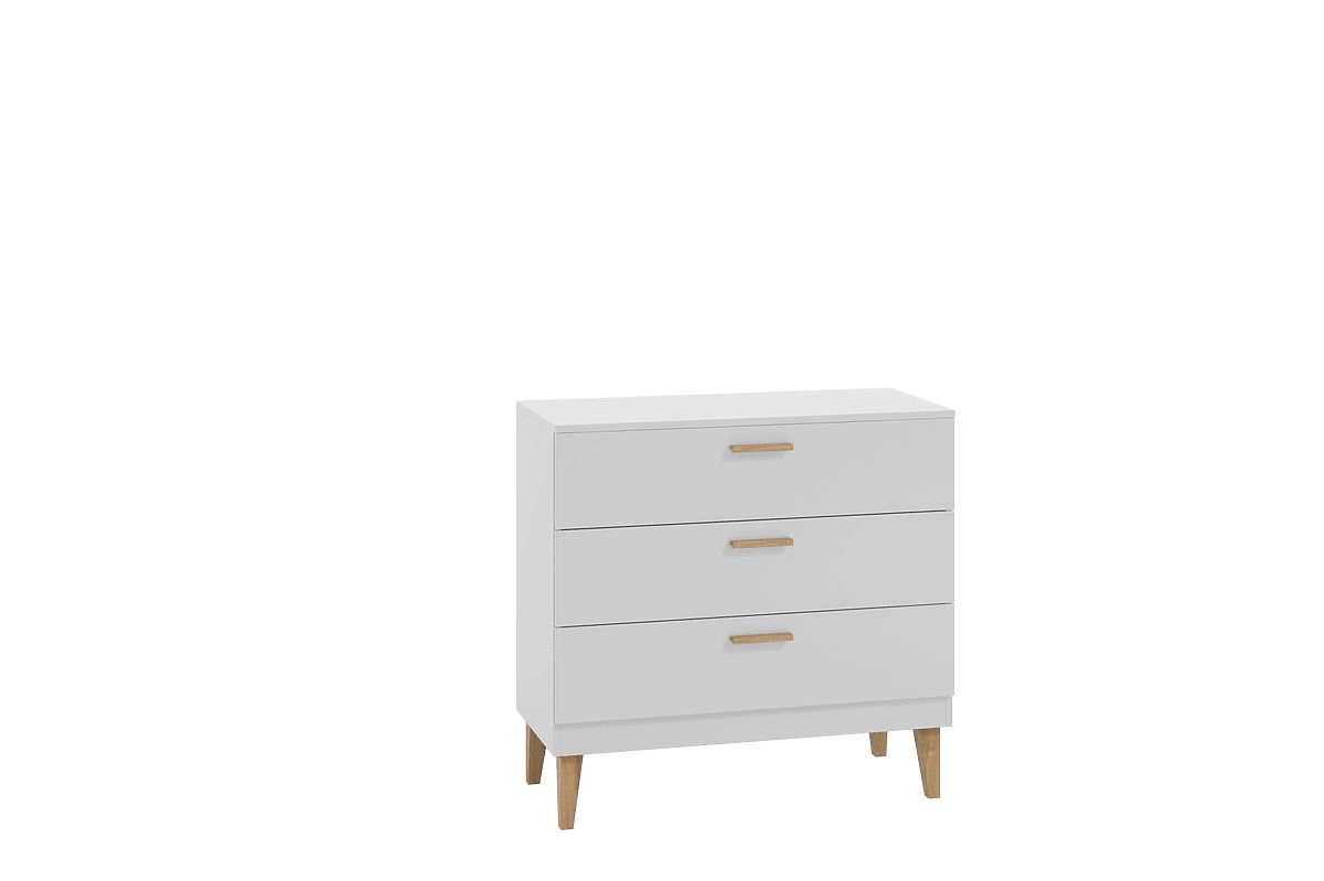 Snežno bela komoda KUBI je izdelana iz visokokakovostne pohištvene plošče. Masivne hrastove noge odlično poudarjajo sodoben skandinavski slog, ki ga lahko popolnoma uskladite s katero koli notranjostjo.