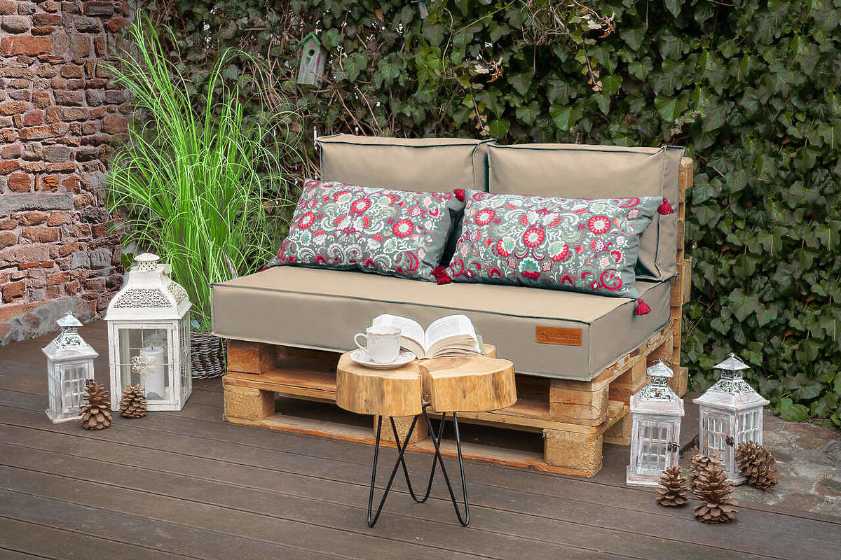 Bež komplet blazin za pohištvo iz palet je odlična izbira za enostavno popestritev sedežne garniture na terasi, balkonu ali vrtu. Idealno pripravljen za dimenzije europalet. Posebna tehnologija šivanja zagotavlja UV odpornost in vodoodpornost materiala, zaradi česar material ostane močan in ne zbledi.
