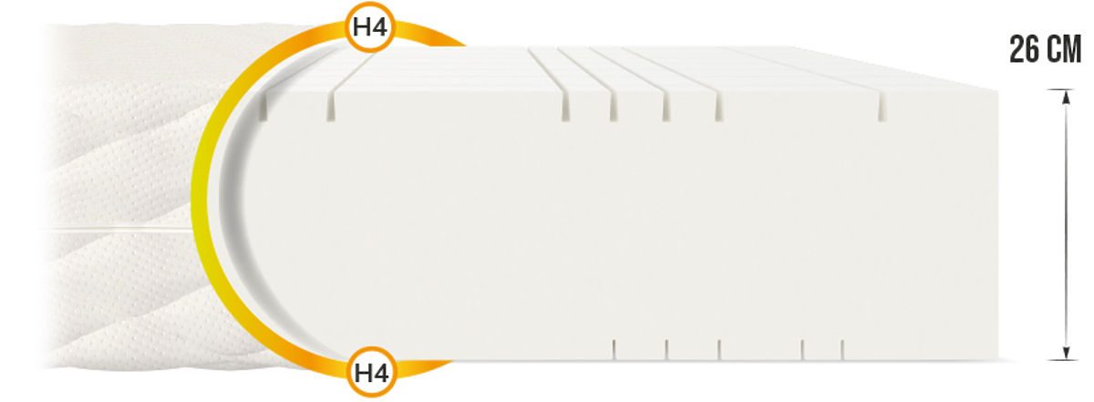 Če se zanašate na kakovosten in udoben spanec, je vzmetnica iz pene Goya Max Plus z višino 26 cm prava izbira. Zahvaljujoč nizu prečnih in vzdolžnih rezov je dvostransko ležišče razdeljeno na 7 con . Posledično je bilo doseženo znatno povečanje plastičnosti, ki zagotavlja odlično podporo hrbtenici .