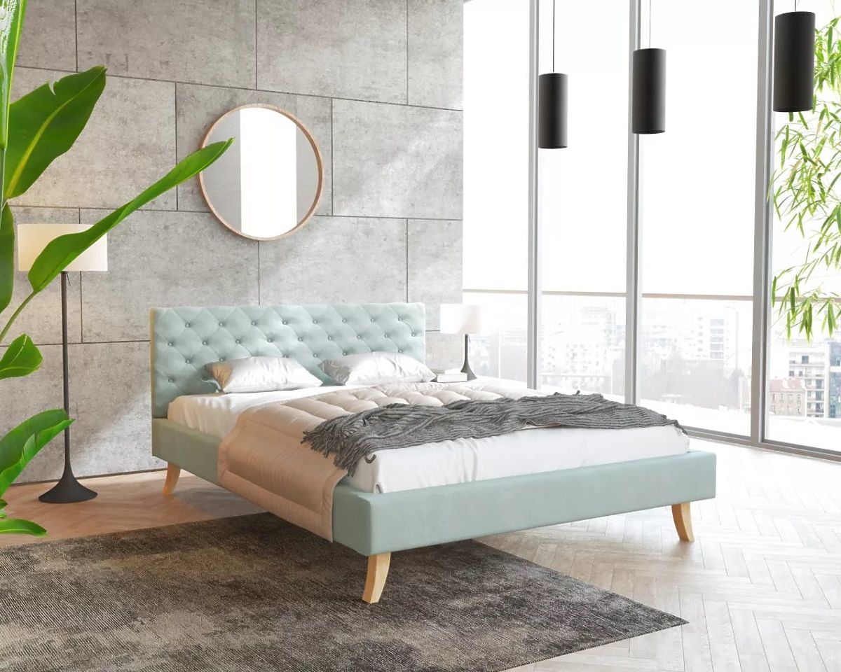 Oblazinjena postelja Kalifornia v mint odtenkih z dimenzijami 120 x 200 cm. .. več