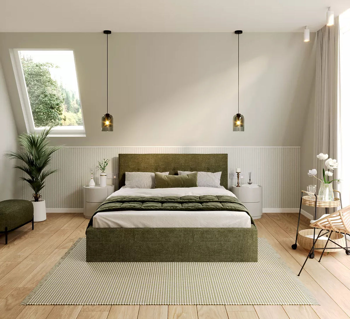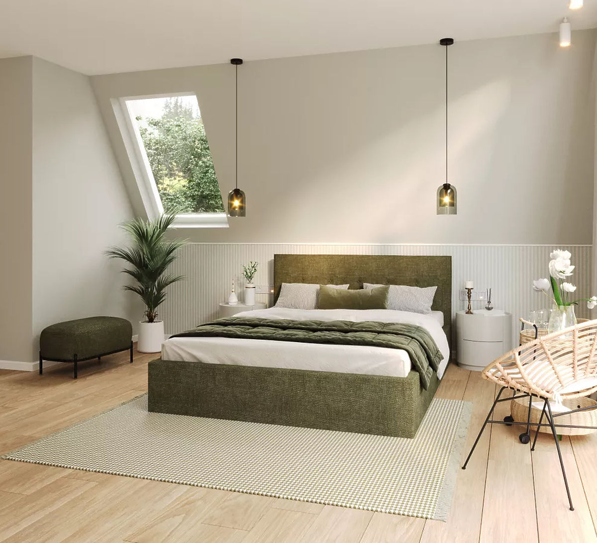 Olivno zelena oblazinjena postelja TULSA dimenzij 160 x 200 cm je odlična izbira za spalnico. Ta postelja ponuja kombinacijo elegance in udobja, zaradi česar je idealna za vašo sobo. Dimenzije 160 x 200 cm so dovolj široke in dolge za udobno spanje dveh oseb. Olivno zelena barva doda prostoru svežino in umirjenost ter tako ustvari prijetno vzdušje v vaši spalnici.