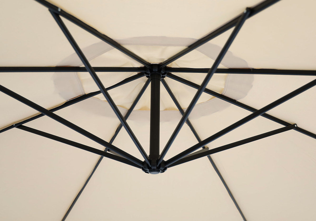 Dežnik se naslanja na kovinsko ogrodje v obliki križa, ki ga s pomočjo posebnih lukenj pritrdimo na tla. Če želite dežnik postaviti na mehko podlago, na primer na zelenico, lahko uporabite univerzalno utež za vrtne senčnike, ki jo najdete tudi v naši ponudbi .