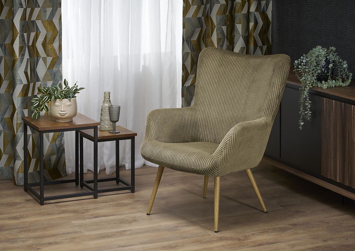 Velvet v olivni barvi daje fotelju mehak in prefinjen videz. Ta tkanina ni samo prijetna na dotik, ampak je tudi trpežna in enostavna za vzdrževanje, kar zagotavlja dolgo življenjsko dobo vašega stola.