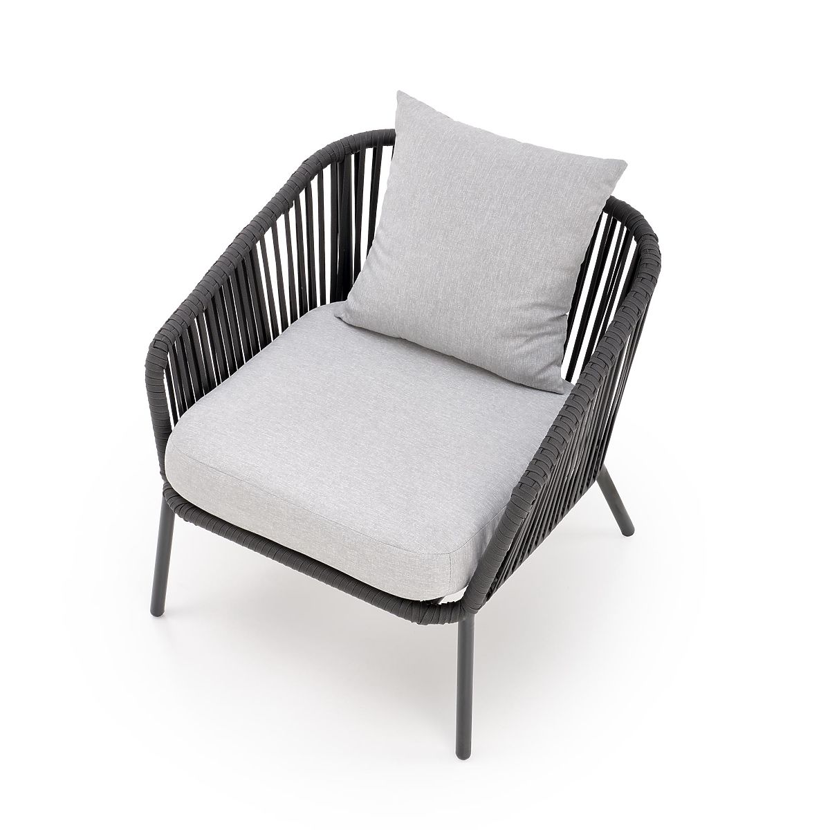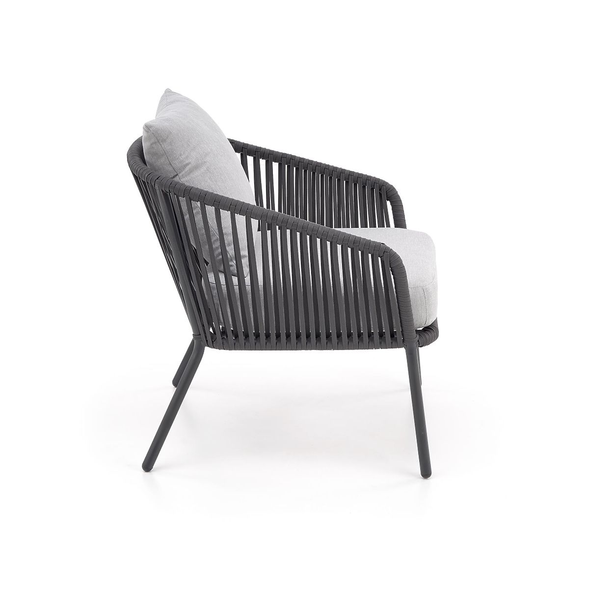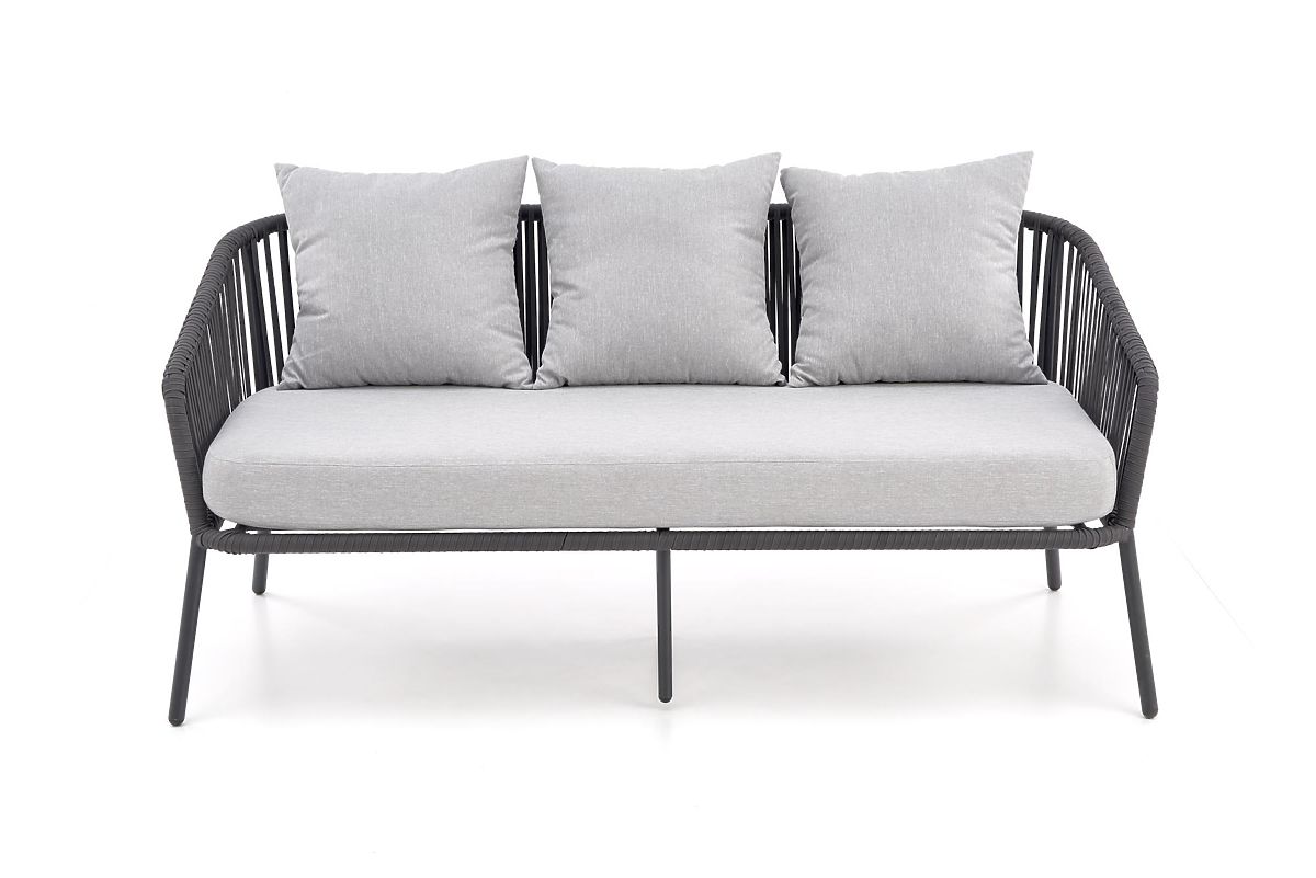 To dvoriščno pohištvo je izdelano iz praškasto lakiranega aluminija v kombinaciji z vrvmi v temno pepelnati barvi, kar doda zasnovo celotnemu dizajnu in robustnost. Aluminij odlikuje visoka odpornost na vremenske vplive in zagotavlja dolgo življenjsko dobo pohištva.