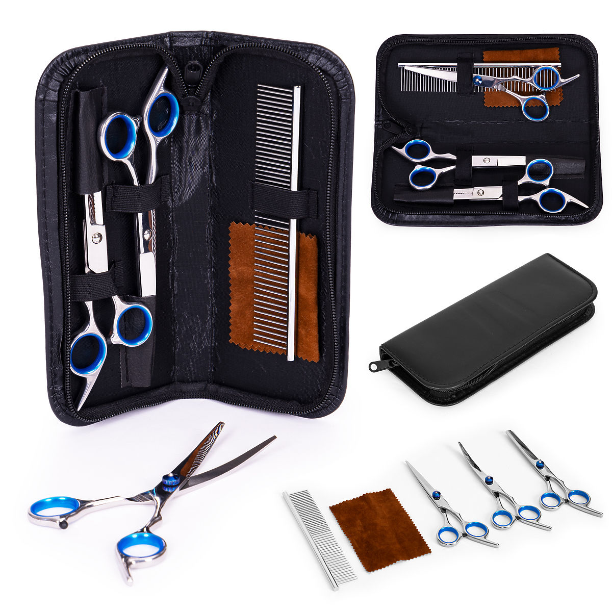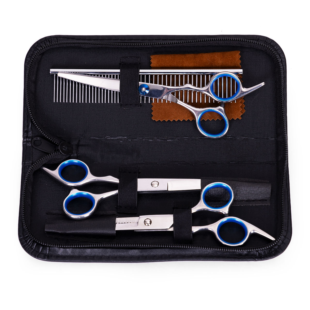 Komplet škarij je bil ustvarjen z upoštevanjem varnega striženja in nege psov in mačk, kar zagotavlja natančnost in udobje tako za lastnike kot za naše ljubljenčke. Komplet vsebuje tri različne vrste škarij, ki jih lahko prilagodimo različnim potrebam nege. Poleg tega komplet za nego vsebuje praktičen glavnik, ki je primeren tako za gladko kot za zavozlano dlako, vse je zapakirano v majhen etui iz ekološkega usnja.