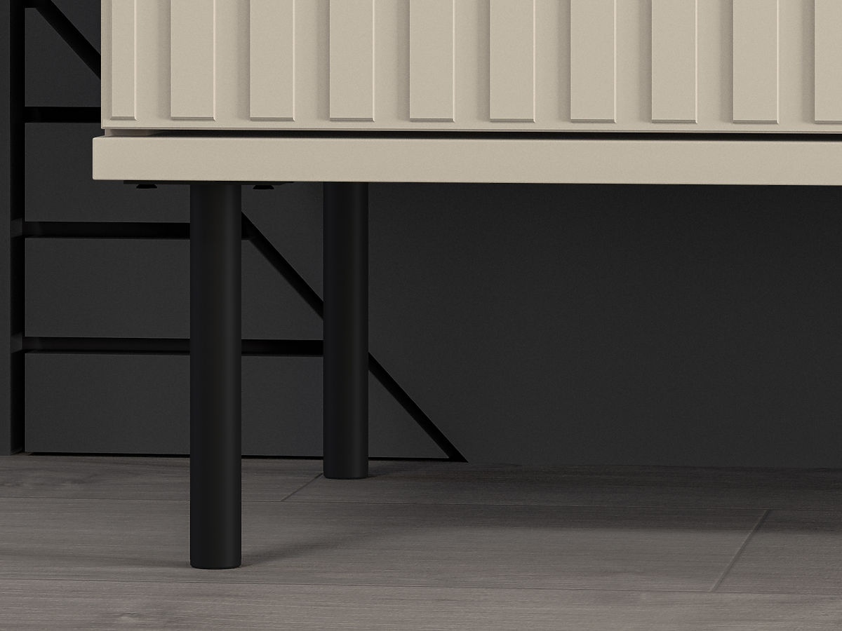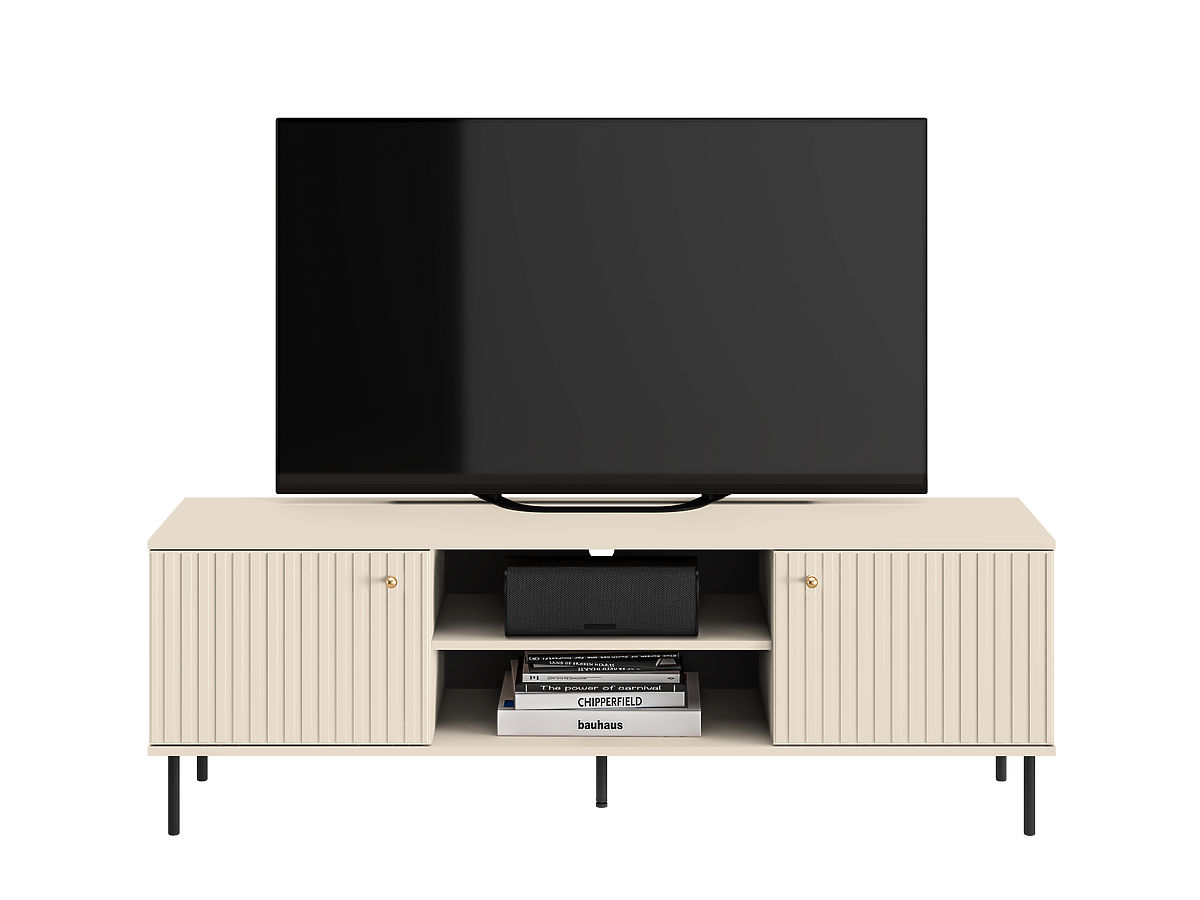 TV mizica Sophie v bež barvi združuje eleganco, praktičnost in sodoben dizajn. Zahvaljujoč velikemu odlagalnemu prostoru zagotavlja dovolj prostora za različne elektronske naprave, knjige ali druge stvari. Zanimiv element pohištva so moderna rezkana vrata, ki jih dopolnjujejo elegantni zlati ročaji in črne kovinske noge. TV mizica je odličen dodatek k dnevni sobi.