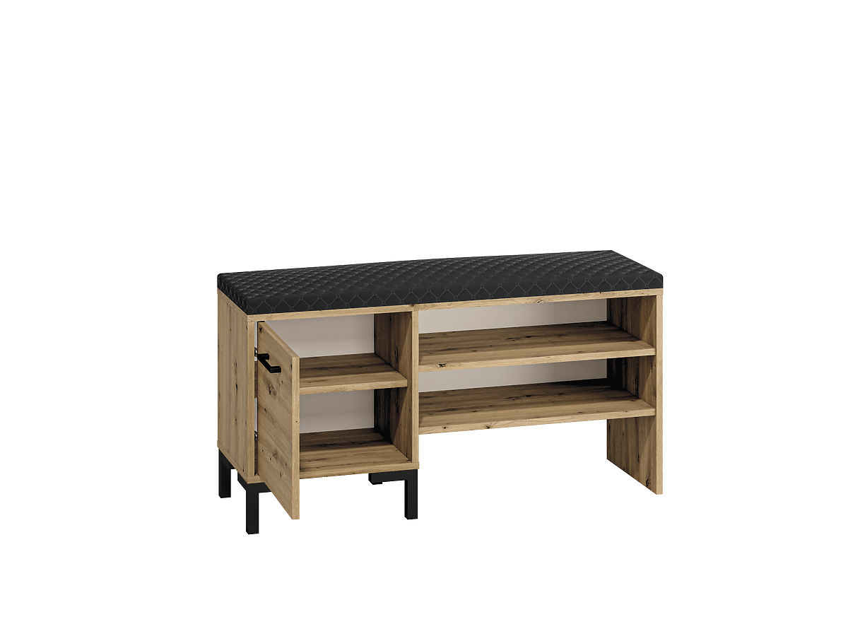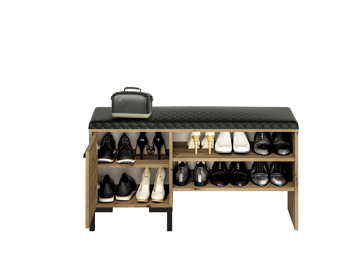 Stojalo za čevlje Nevio se odlično prilega vsakemu hodniku. Ta eleganten kos združuje eleganco, praktičnost in udobje. Hrastov dekor daje škatli za čevlje prijeten naraven videz, ki se odlično prilega različnim vrstam interierjev. Okusno prešit sedež vam nudi najvišje možno udobje med obuvanjem in sezuvanjem čevljev. Veliko prostora za shranjevanje vam omogoča organiziranje čevljev in ohranjanje čistega in urejenega vhoda.