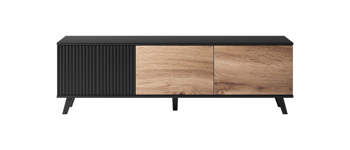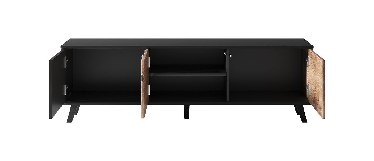 Material: TV omarica je izdelana iz furnirane MDF in furnirane pohištvene plošče, kar zagotavlja njeno trpežnost in dolgo življenjsko dobo. MDF je znan po svoji stabilnosti in gladki površini, idealen za kakovostne površinske obdelave. Noge omarice so iz polipropilena, kar zagotavlja trdnost in stabilnost.