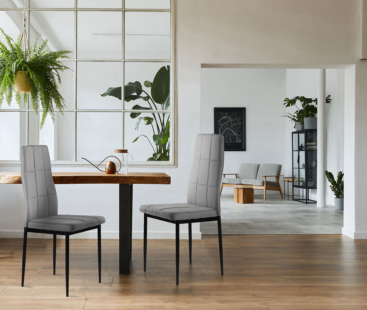 Stoli se bodo odlično ujemali z družinsko mizo v vaši jedilnici in kuhinji. Sivi prešiti pohištvo iz prijetne tkanine na dotik se prilega vsakemu interierju in mu doda pravi čar.