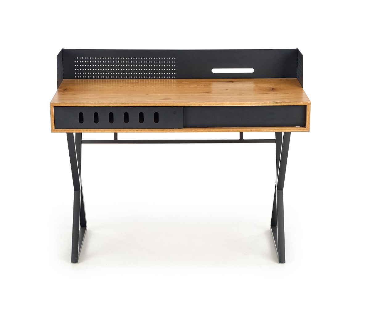 Moderna pisalna miza z elegantnim dizajnom, ki združuje zlati hrast in črno barvo. Izdelana je iz furnirane MDF in prašno lakiranega jekla, kar zagotavlja visoko kakovost in vzdržljivost. Idealna za domačo pisarno ali delovni kotiček.