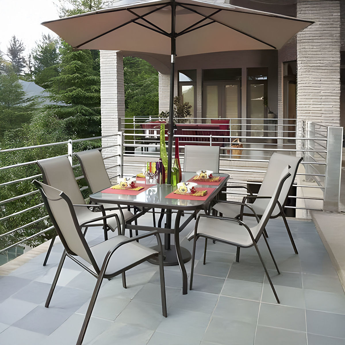 Vrtna miza s kaljeno stekleno ploščo in odprtino za senčnik. .. več