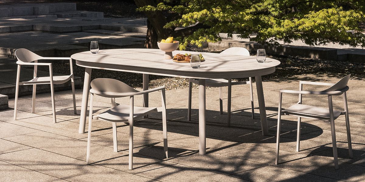 Ovalna raztegljiva miza iz prašno lakiranega aluminija. .. več