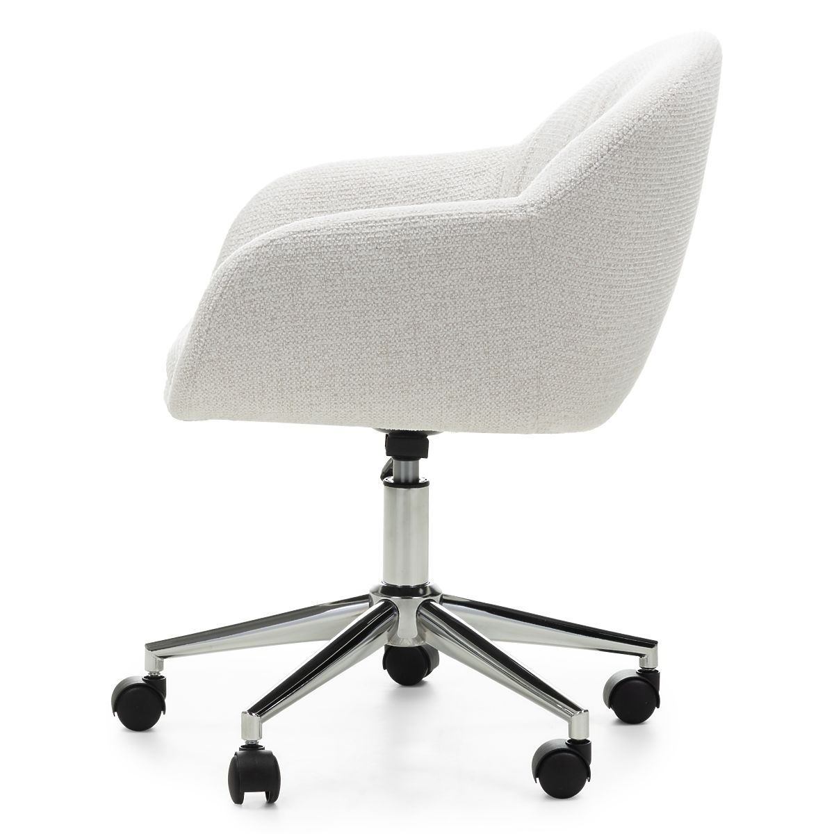 vrtljiv stol Oti – stilski dodatek za vašo pisarno, toaletno mizico ali domačo pisarno, ki združuje eleganco s funkcionalnostjo. Zahvaljujoč oblazinjenju v nežnem kremnem odtenku prinaša v notranjost občutek lahkotnosti in harmonije, popolnoma se prilega sodobnemu dizajnu. Kromirane noge na kolesih dodajajo celoti prefinjenost in hkrati zagotavljajo popolno mobilnost in svobodo gibanja. Naslonjalo z nežnimi gubami in udobni nasloni za roke zagotavljajo, da vsak trenutek postane pravi počitek. Nastavljiva višina in funkcija vrtenja za 360° zagotavljata maksimalno svobodo. Ne glede na to, ali delate, ustvarjate ali samo počivate – Oti bo poskrbel za vaše udobje. Izberite stol, ki bo poudaril vaš slog in naredil vsakodnevne obveznosti užitek.