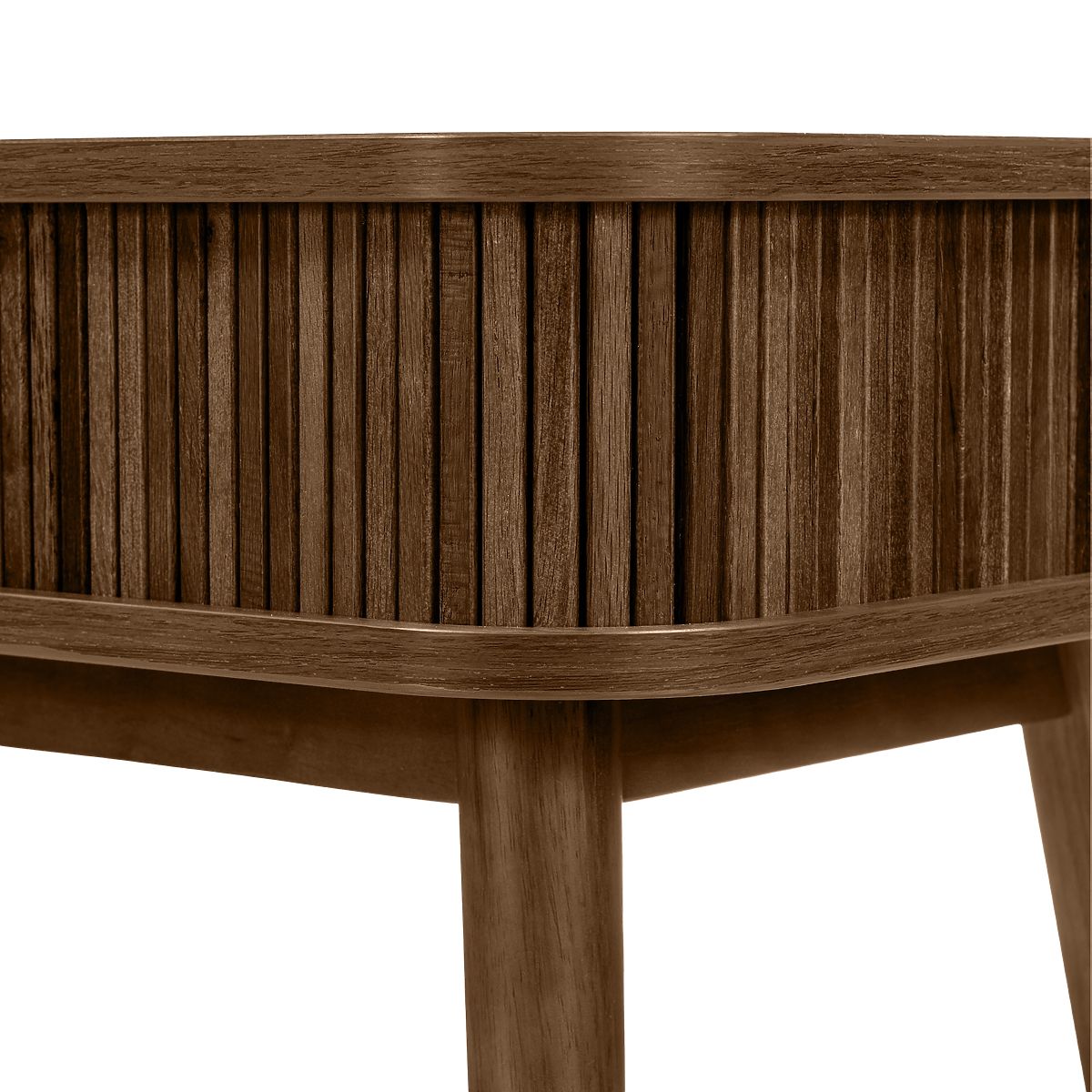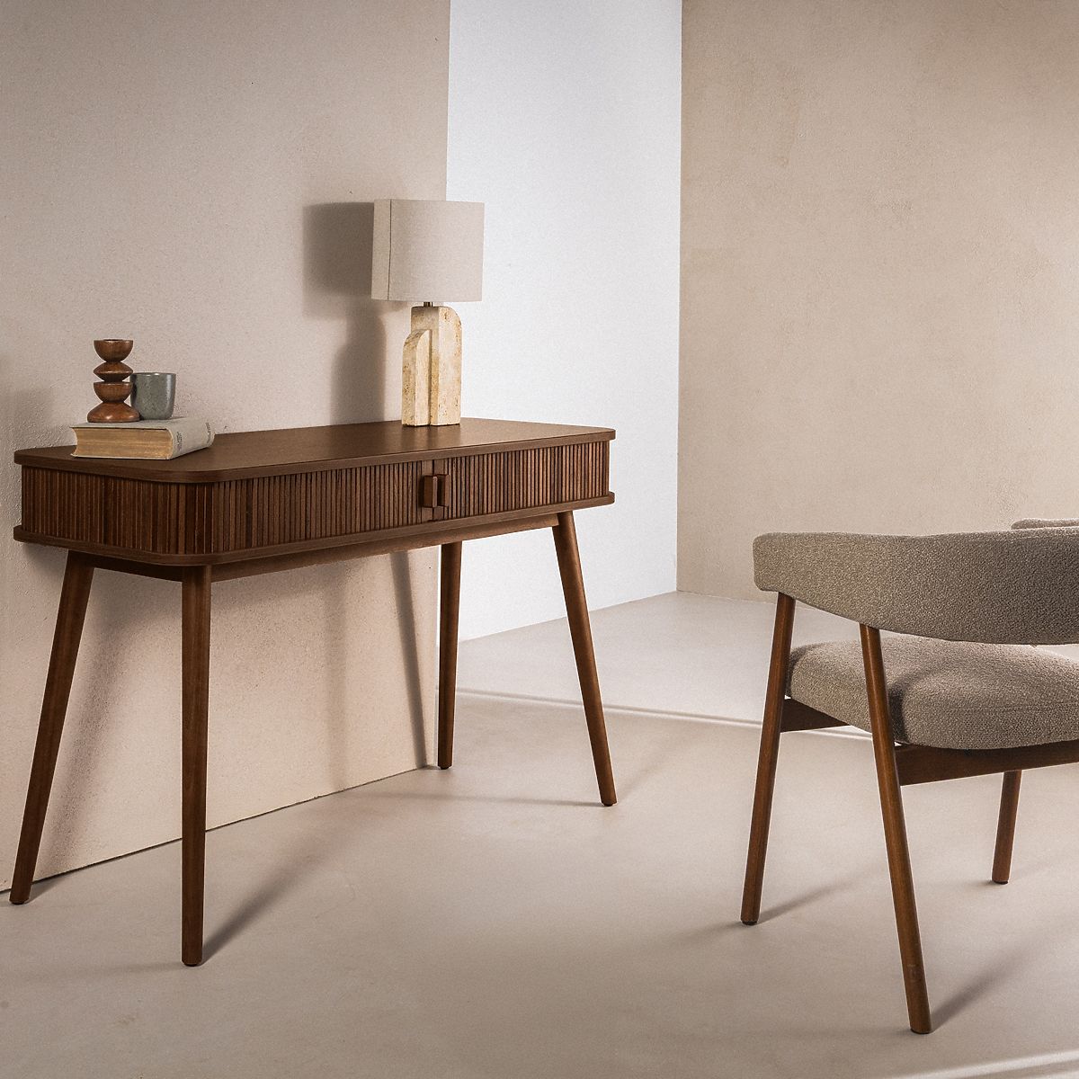 Pisarna miza Clemente je stilsko in praktično pohištvo, ki se odlično prilega tako v moderne kot klasične interiere. Njegovi zaobljeni robovi in visoke lesene noge mu dajejo lahkotnost in eleganco. Zahvaljujoč vratom iz masivnega hrastovega lesa, ki se premikajo na stran in so okrašena z dekorativnimi letvicami, miza nudi shranjevalni prostor za različne pisarniške potrebščine in daje interierju edinstven značaj. Korpus iz melaminske plošče v barvi oreha in trdne noge iz masivnega kavčukovega lesa celovito poudarjajo visoko kakovost in stil pohištva. Pisarna miza Clemente je izjemna kombinacija oblikovne elegance s trajno trdnostjo, ki ne le okrasi vaš prostor, ampak tudi ustvarja ergonomsko in urejeno delovno mesto.