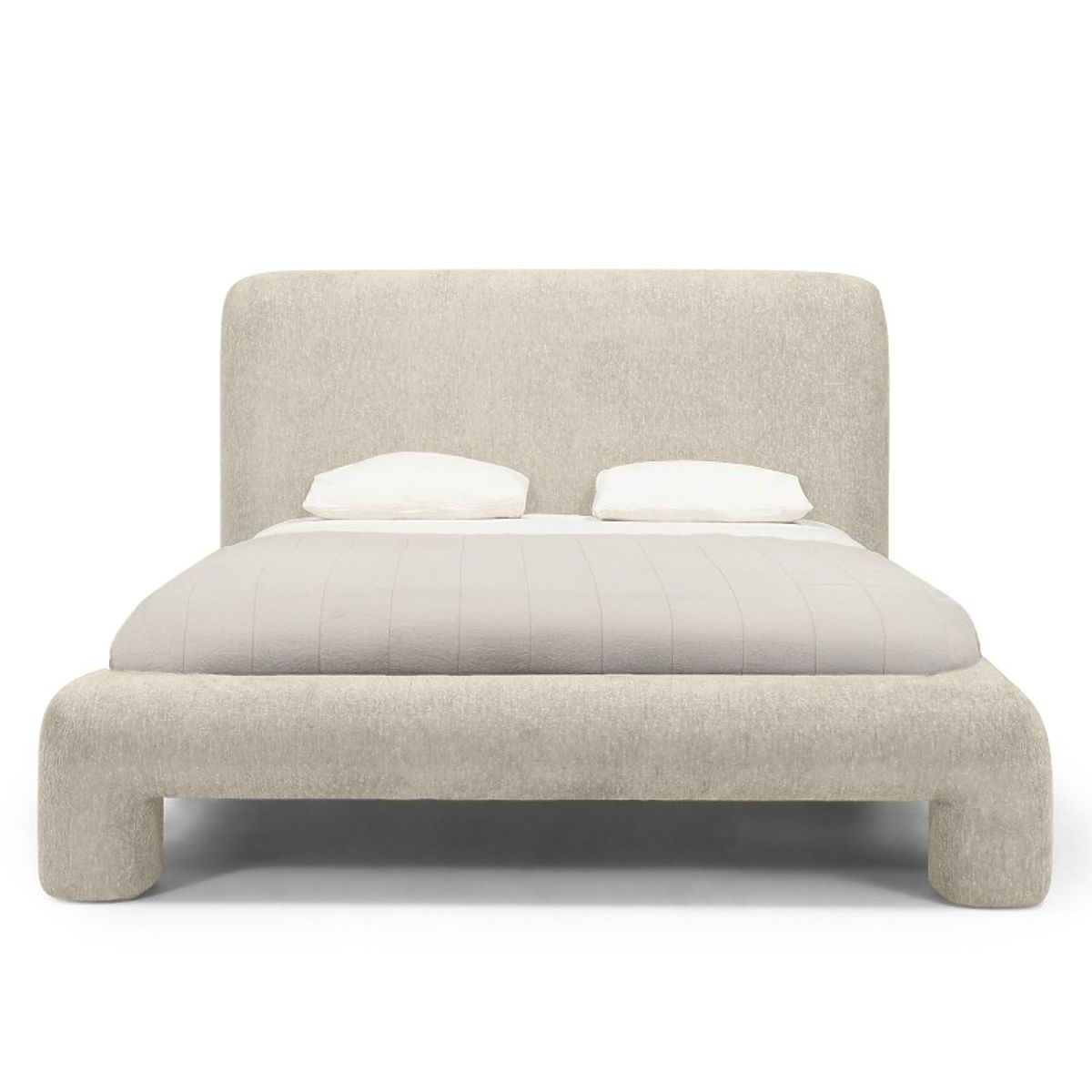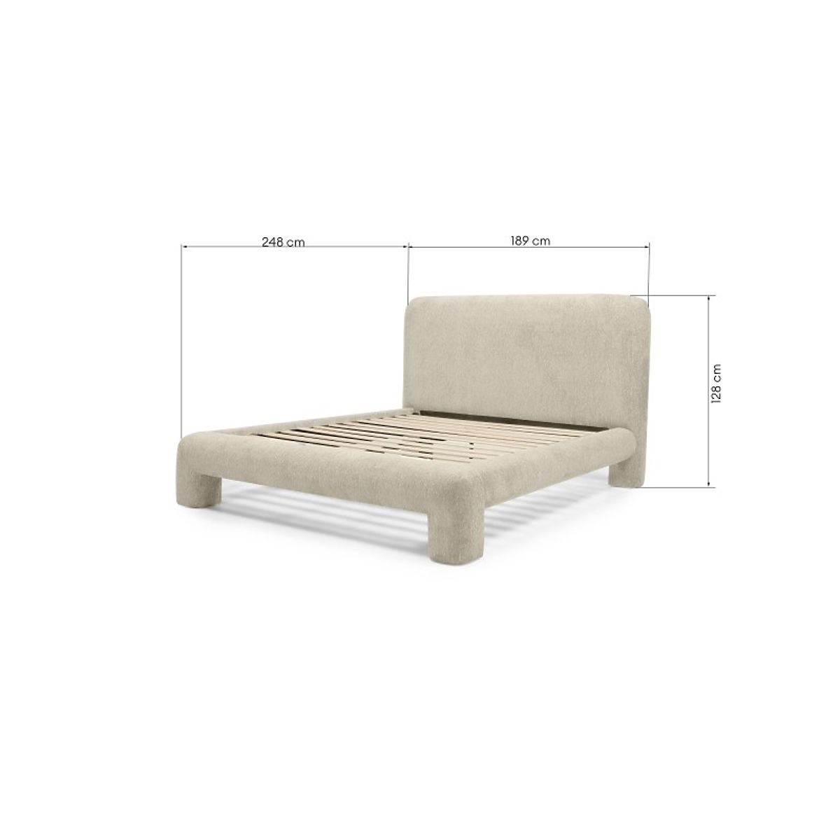 Oblazinjena postelja Rolly s svetlo sivim oblazinjenjem in zaobljenimi oblikami. .. več