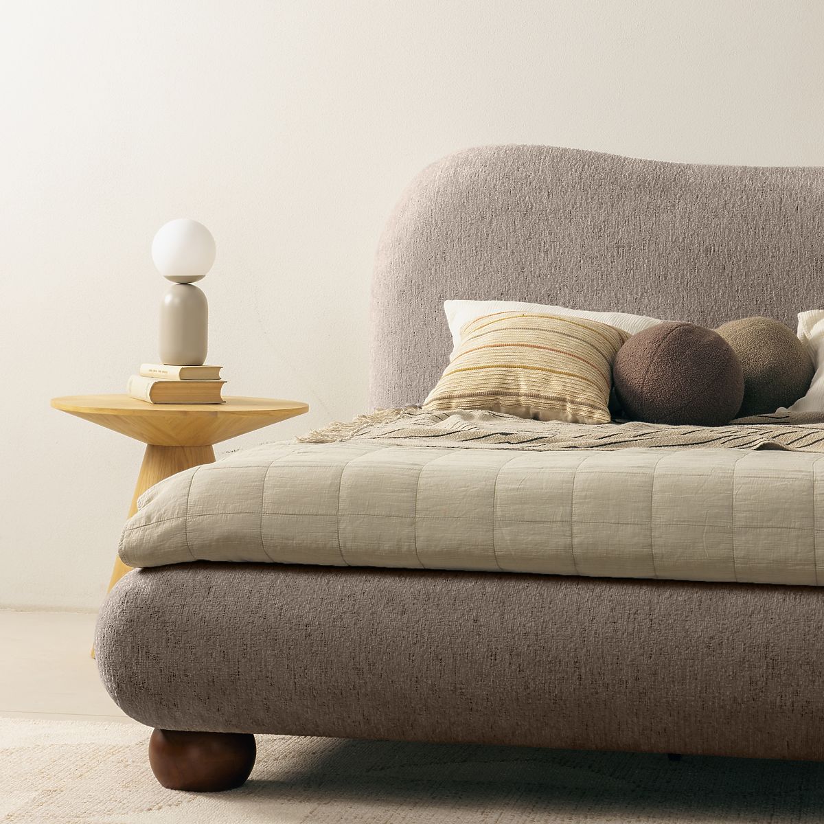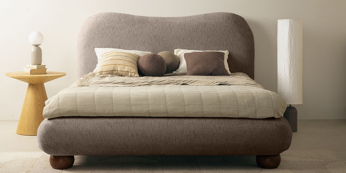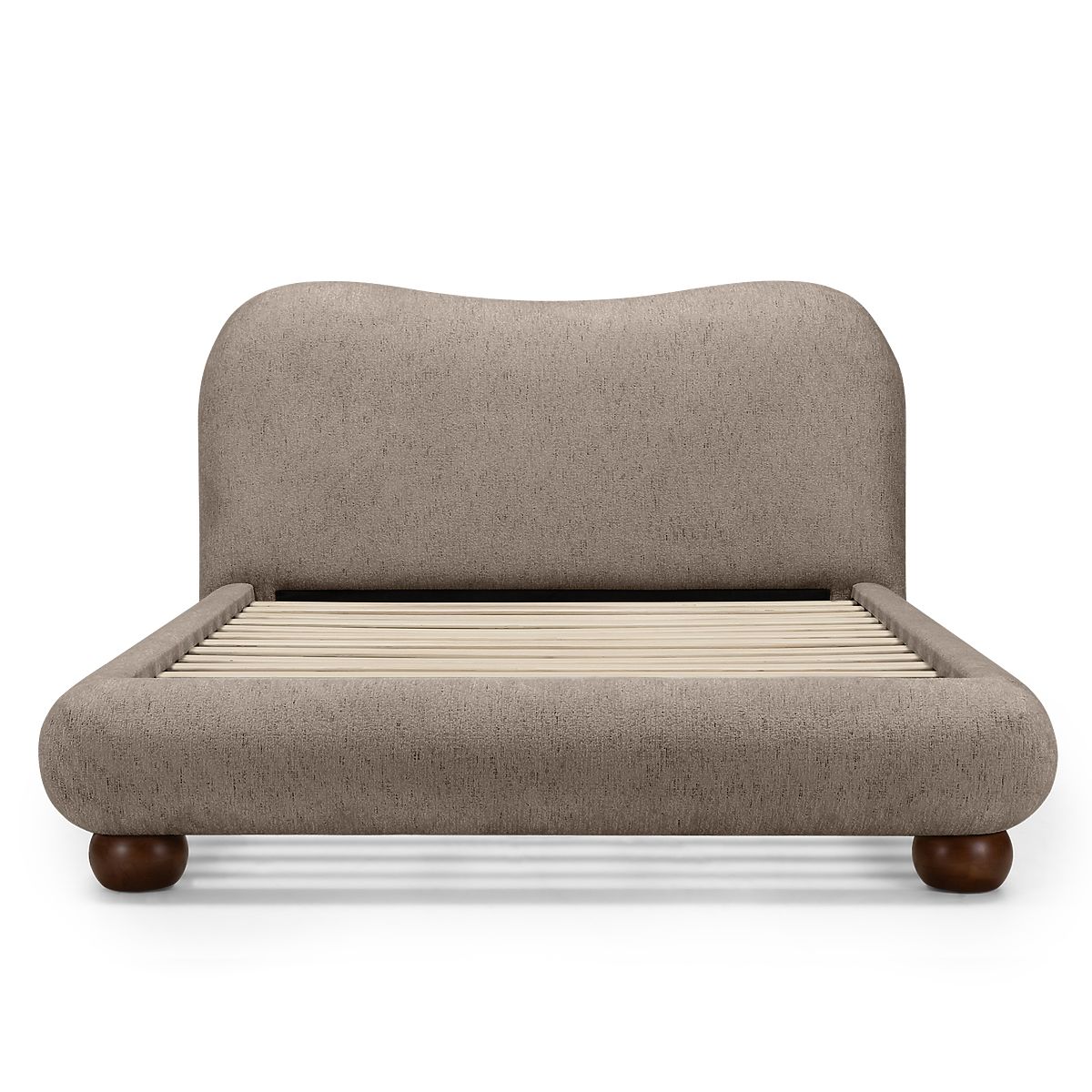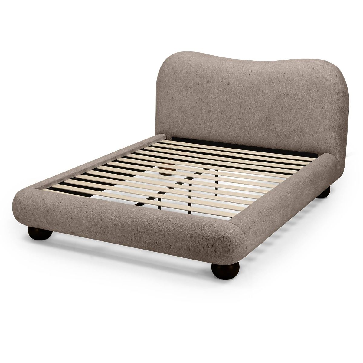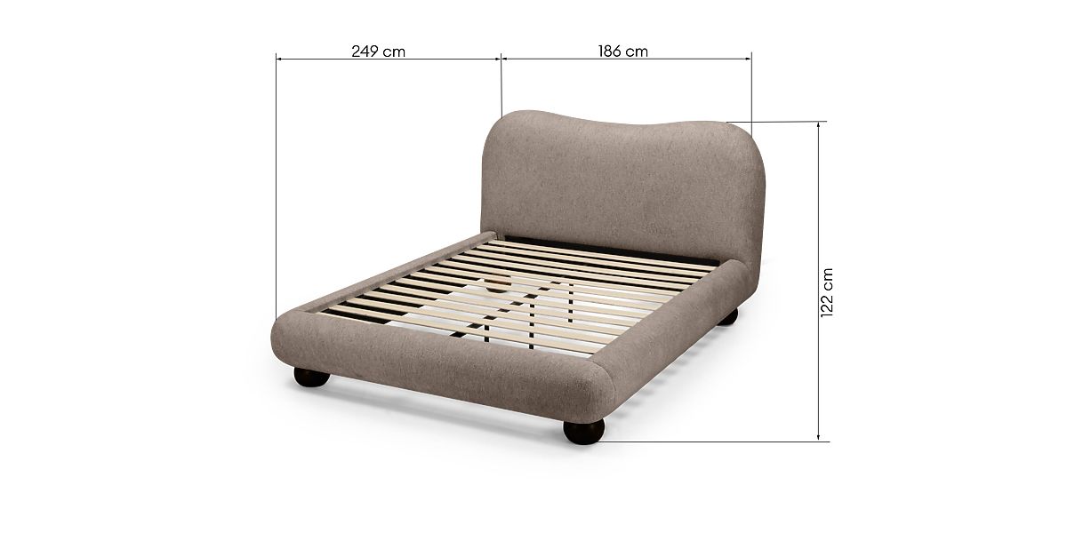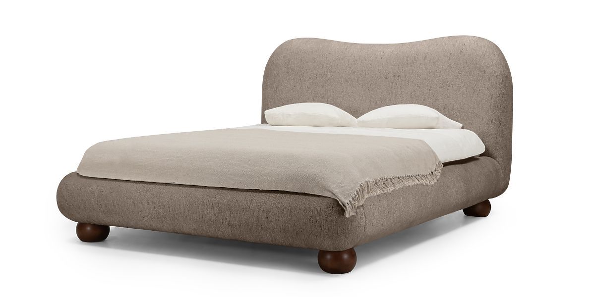 Oblazinjena postelja Bowee s sivim odtenkom in kroglastimi nogami. .. več