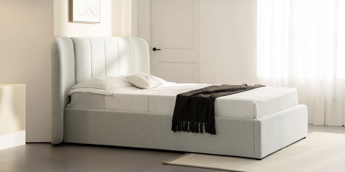 Oblazinjena postelja Snoovia z letvami in shranjevalnim prostorom. .. več