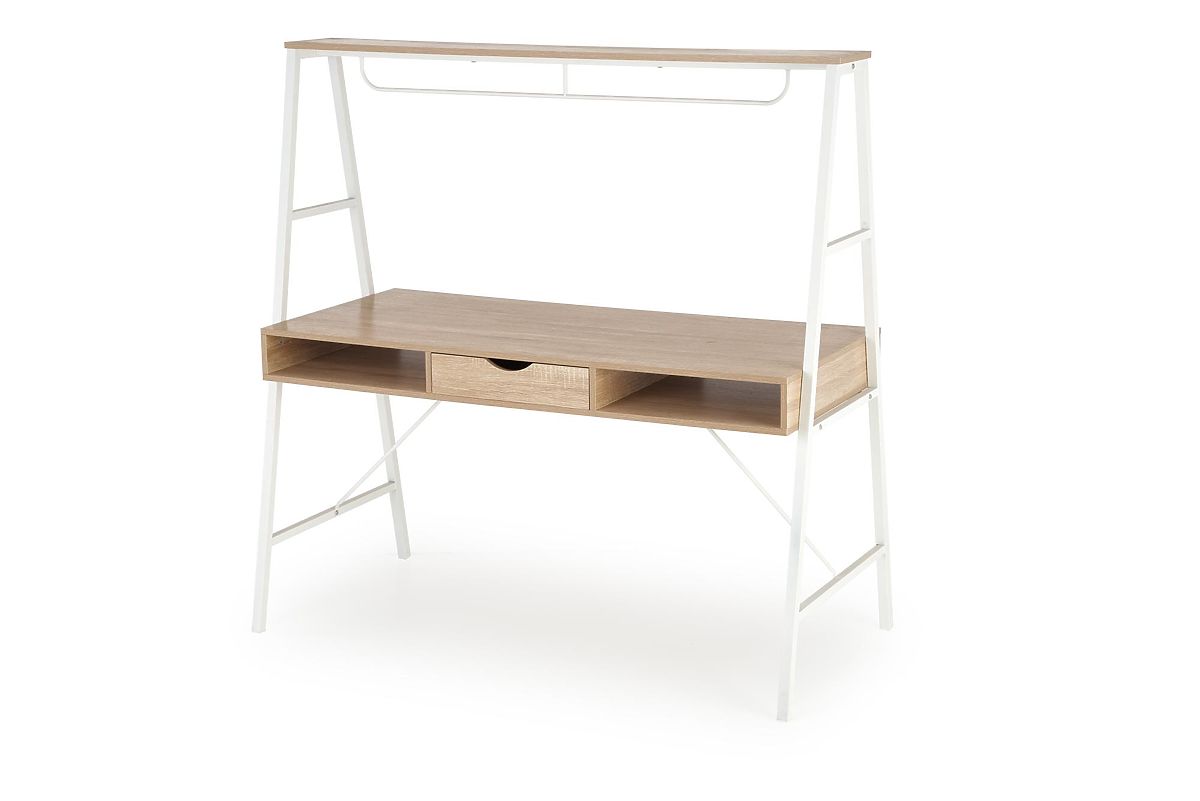 Ta moderna pisalna miza je odlična izbira za domačo pisarno, pisarno, otroško ali študentsko sobo. Združuje funkcionalnost, trpežnost in stilski dizajn v prijetnem dekorju svetlega lesa dopolnjenem z belimi elementi. Delovna površina ponuja dovolj prostora za delo na računalniku, študij ali organizacijo dokumentov. Miza je opremljena s praktičnimi shranjevalnimi deli, ki pomagajo ohranjati delovni prostor urejen. Prednji deli so izdelani iz kakovostne MDF v mat izvedbi, medtem ko stabilno ogrodje tvori trdna kovinska konstrukcija, prav tako v mat izvedbi. Zaradi univerzalne orientacije jo je mogoče enostavno postaviti v različne vrste prostorov in uskladiti z modernimi interierji.