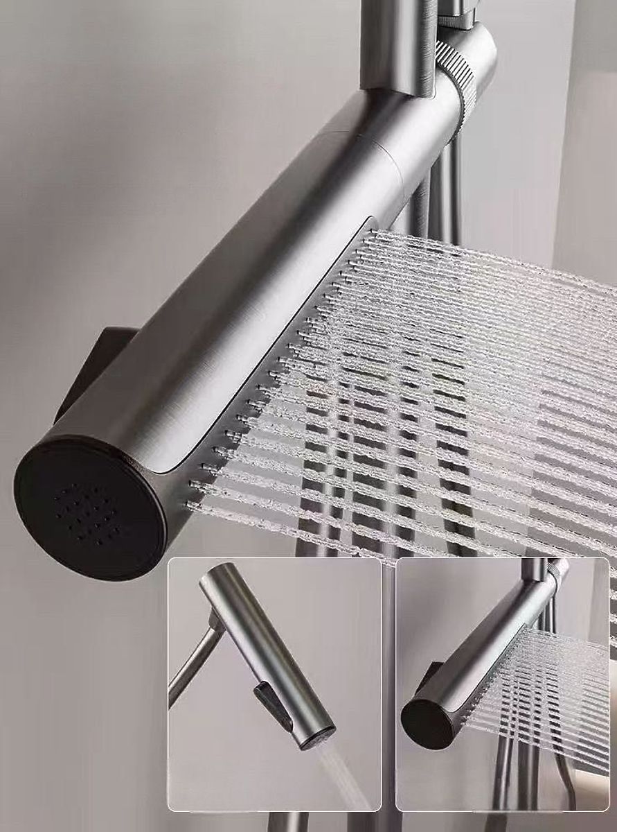Posebno pozornost si zasluži razširjena funkcionalnost: v držalu kompleta je integrirana izvlečna, dvofunkcijska pršna glava s kaskadnim in stranskim tokom vode, ki lahko služi kot praktična bide glava. Poleg tega komplet vsebuje klasično pršno glavo z modernim videzom – opremljeno s preklopnikom toka vode in deževno prho.