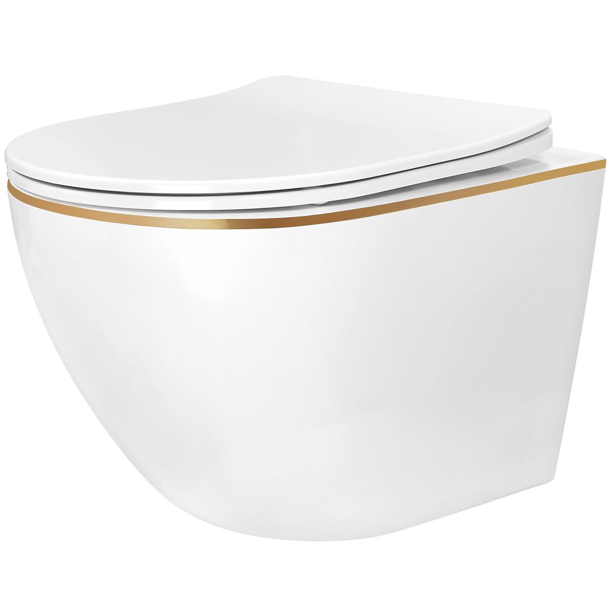 Viseča WC školjka brez roba, bela z zlatim robom in inovativnim splakovalnim sistemom Tornado Nfq (Noise-Free Quiet) je sodobna rešitev, ki združuje eleganco, enostavno vzdrževanje čistoče in učinkovitost splakovanja. Konstrukcija brez roba ne le povečuje modernost, temveč tudi olajša vzdrževanje čistoče okoli školjke. Zasnovana z mislijo na varčnost in ekologijo, školjka porabi minimalno količino vode, ne da bi pri tem izgubila visoko učinkovitost splakovanja. Školjka je združljiva z večino podometnih sistemov Geberit, Grohe, Sanit, Rea.