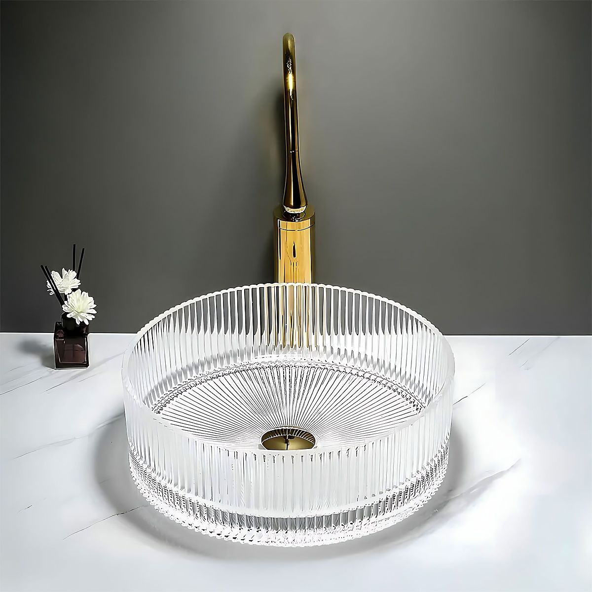 Pohištveni umivalnik Ingrid 36 je idealna izbira za tiste, ki iščejo elegantno in izvirno rešitev za svojo kopalnico. Izdelan iz visokokakovostnega stekla, navdušuje z rebrasto površino in prosojno izvedbo, ki prostoru dodaja edinstven značaj in luksuzen stil.