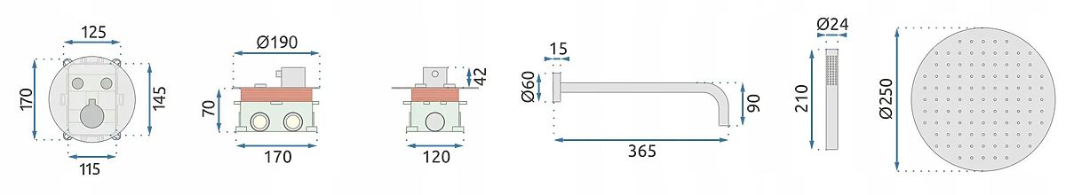 Set je opremljen s sistemom Box, ki omogoča hitro montažo in enostaven dostop do notranjih elementov v primeru potrebe po vzdrževanju. Preprost nadzorni panel poudarja moderen značaj seta in se popolnoma prilega minimalističnim in elegantnim kopalnicam.