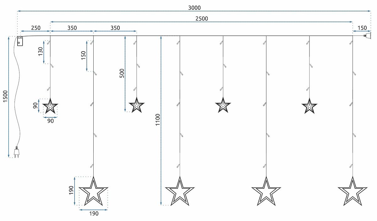 Komplet luči vsebuje 4 viseče LED zvezde velikosti 18,5 × 18,5 cm in 4 zvezdice velikosti 9 × 9 cm. Dolžina girlande je 245 cm.