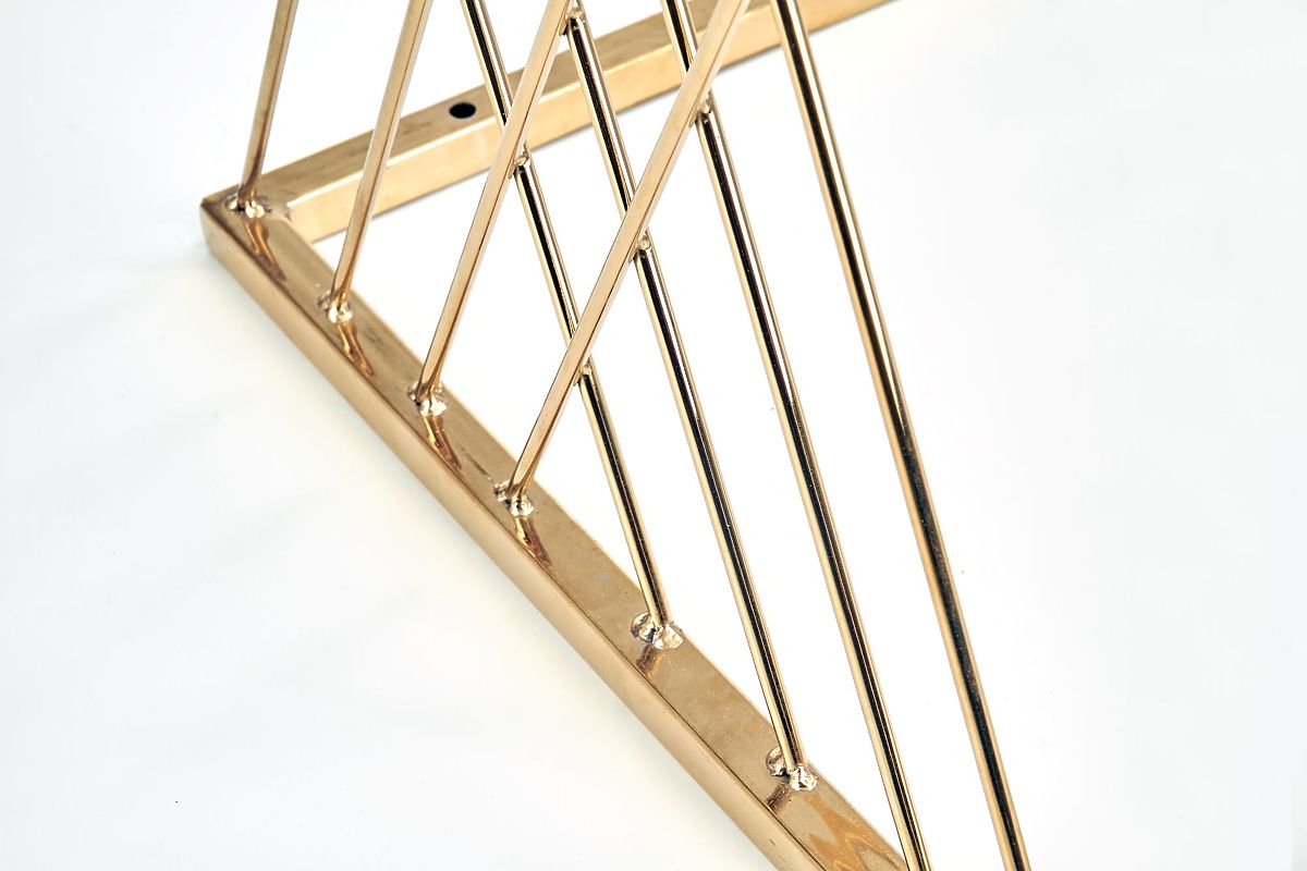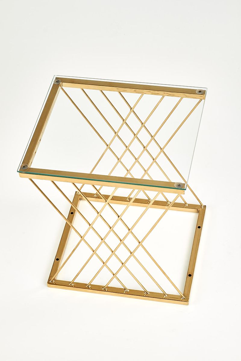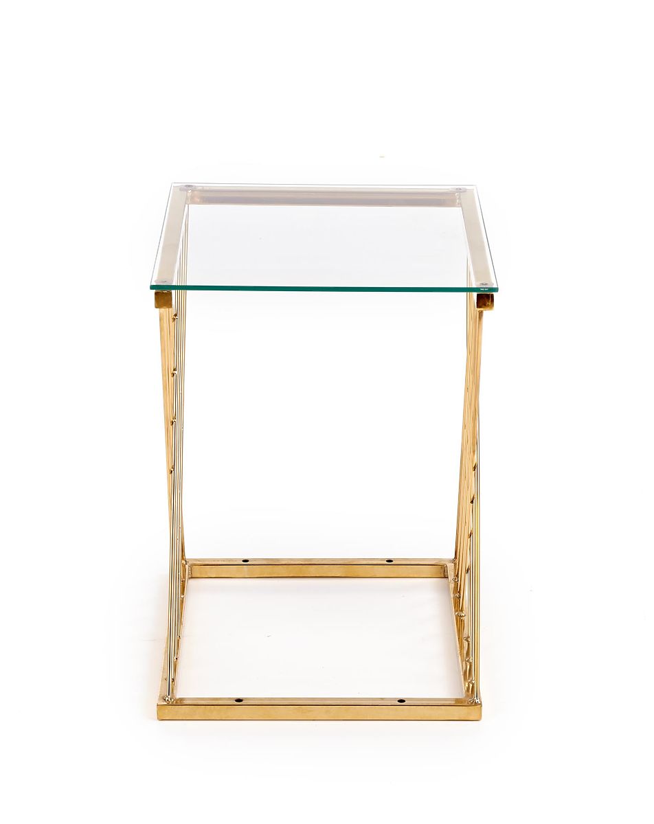 Izvirno oblikovano podnožje v kombinaciji s prozorno stekleno ploščo daje mizi lahkoten in eleganten videz, ki pritegne na prvi pogled. Povezava kromiranega jekla v zlati izvedbi in stekla ustvarja luksuzen vtis in lepo dopolnjuje moderne in glamurozne interierje.