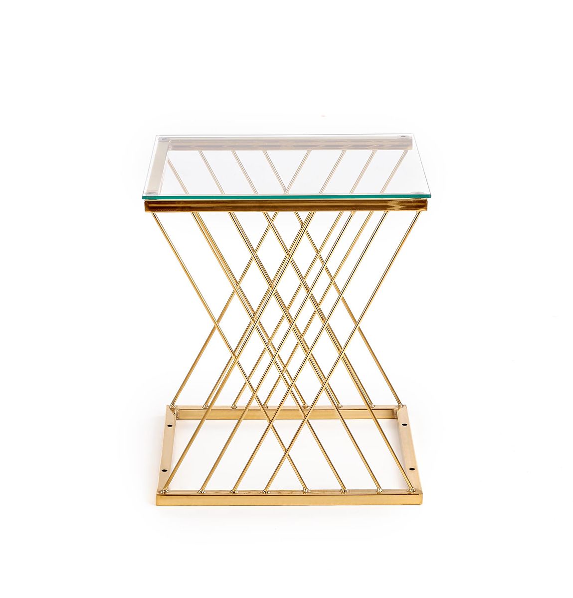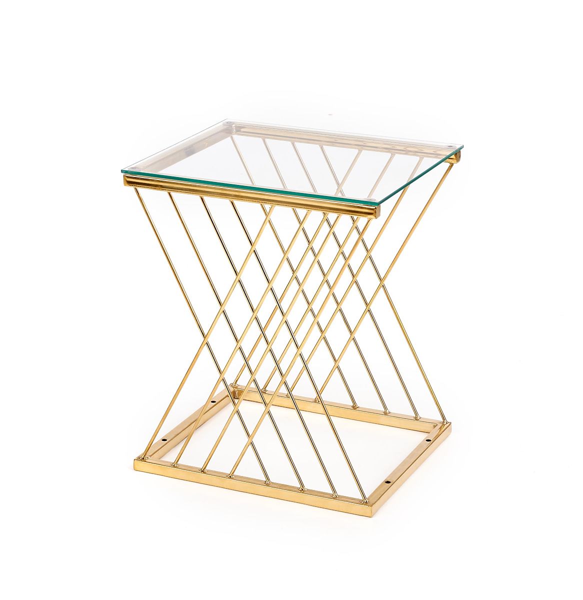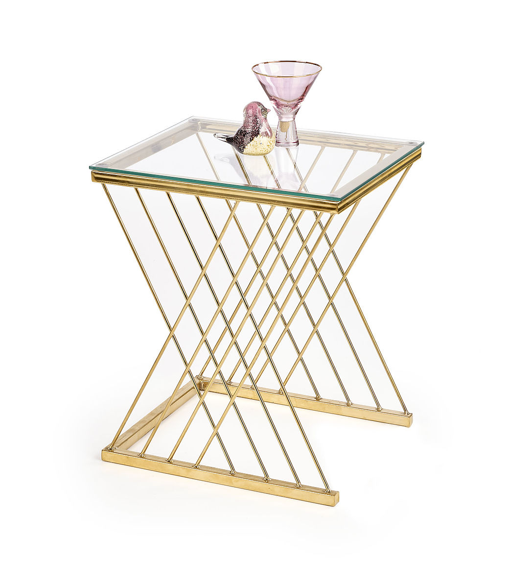 Izvirno oblikovano podnožje v kombinaciji s prozorno stekleno ploščo daje mizi lahkoten in eleganten videz, ki pritegne na prvi pogled. Povezava kromiranega jekla v zlati izvedbi in stekla ustvarja luksuzen vtis in lepo dopolnjuje moderne in glamurozne interierje.