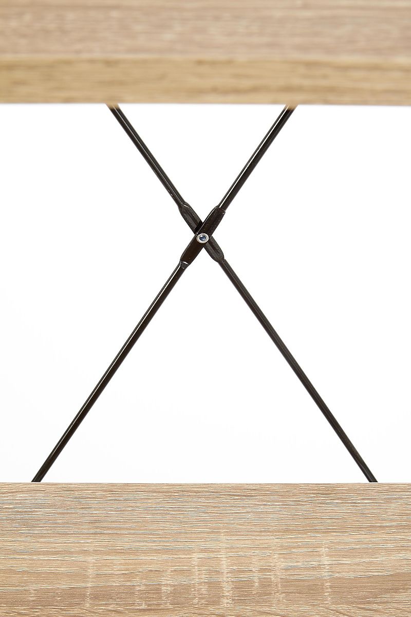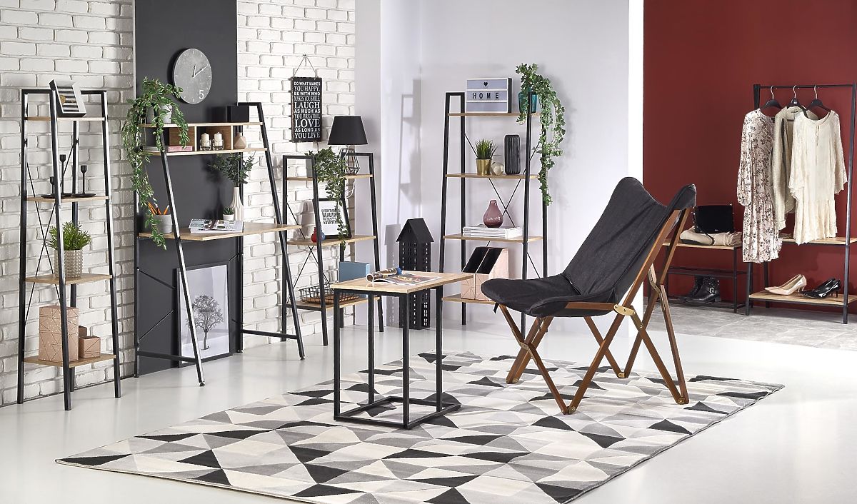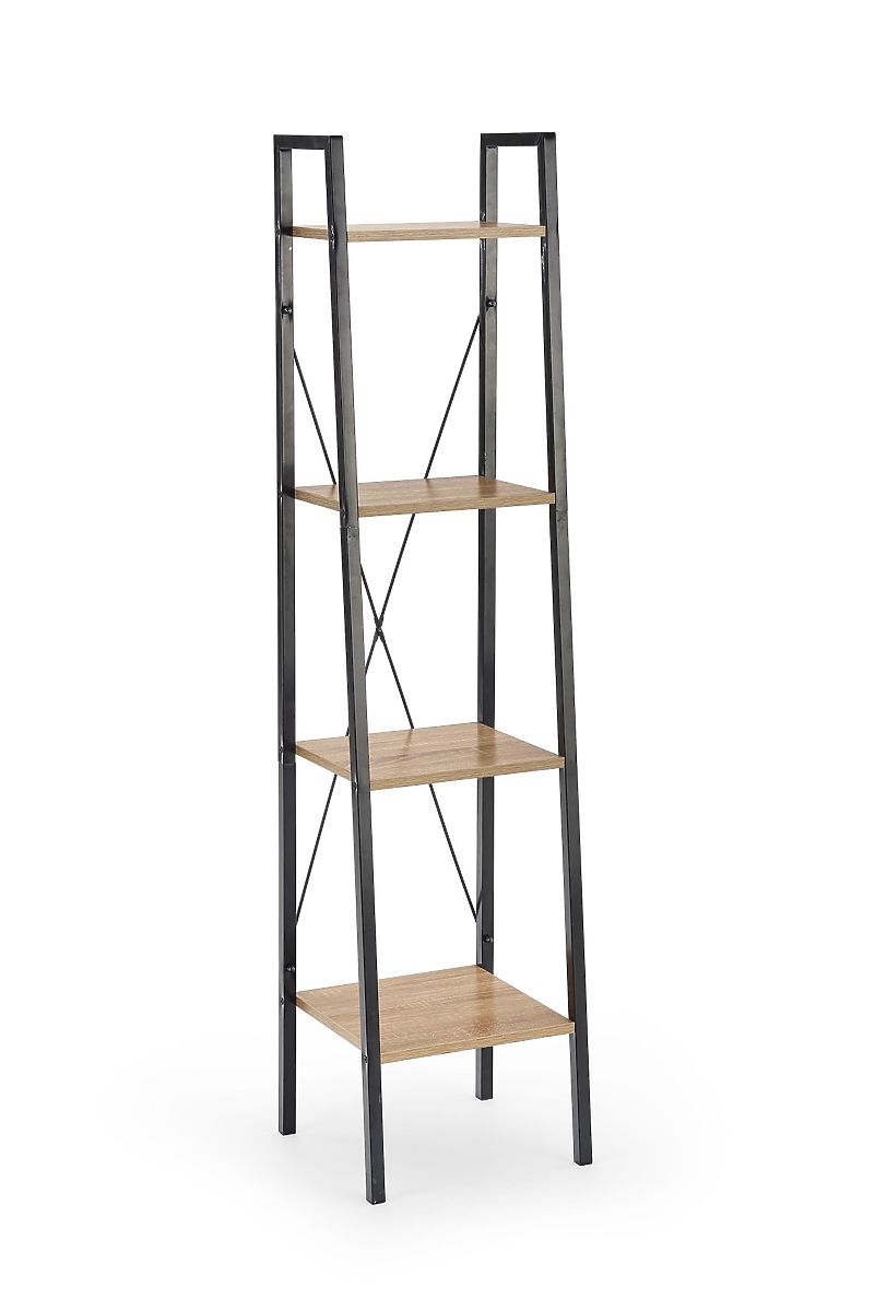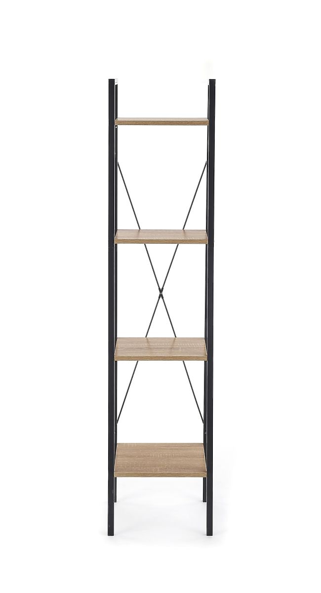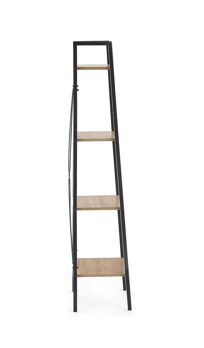 Regal sestavljajo štiri odprte police, ki zagotavljajo pregledno shranjevanje knjig, dekoracij ali dodatkov. Police iz laminirane iverne plošče v dekorju hrast sonoma dopolnjuje trdna konstrukcija iz črne prašno lakirane jekla, ki zagotavlja stabilnost in poudarja industrijski videz.