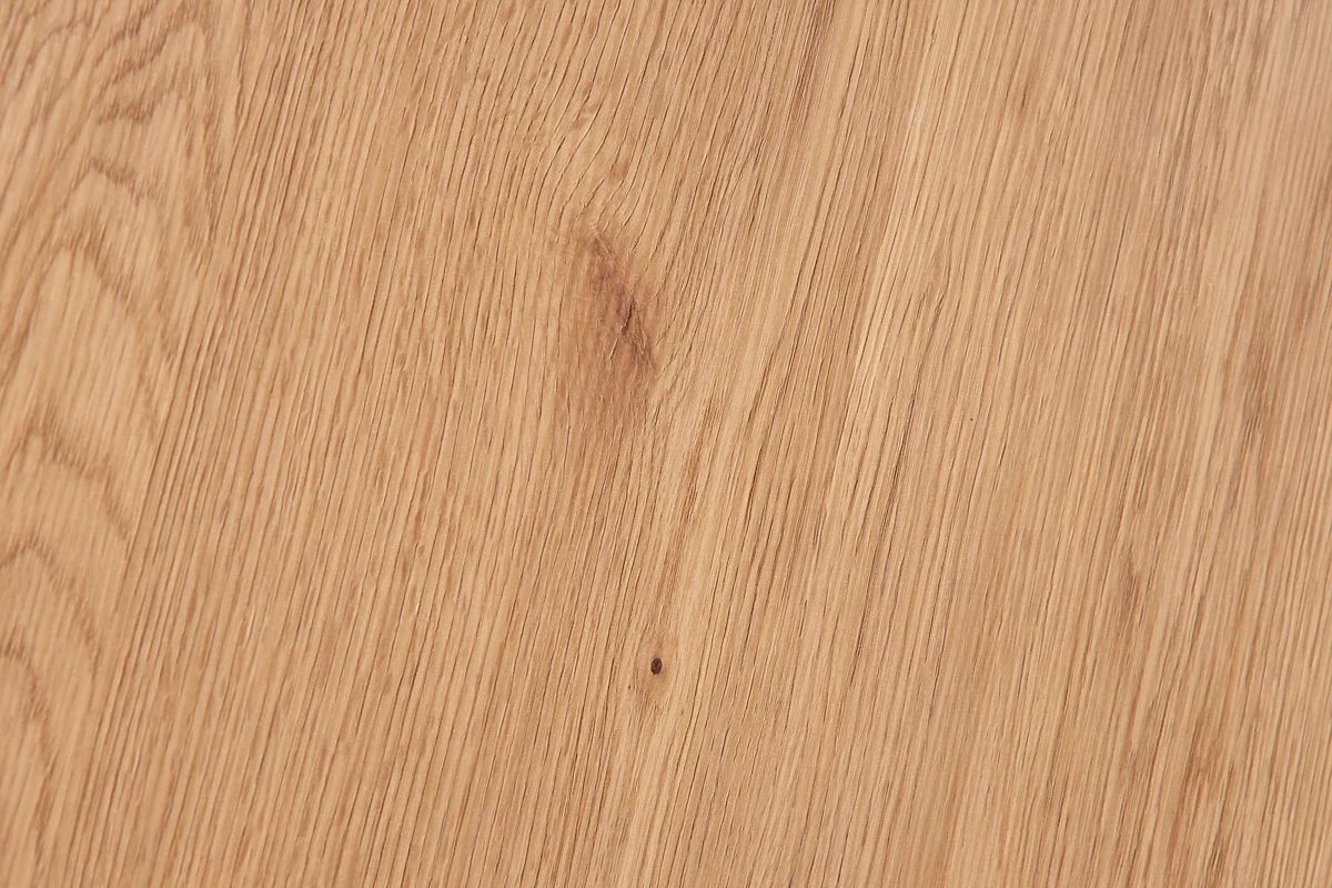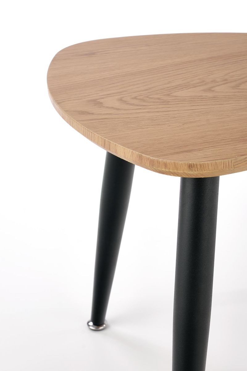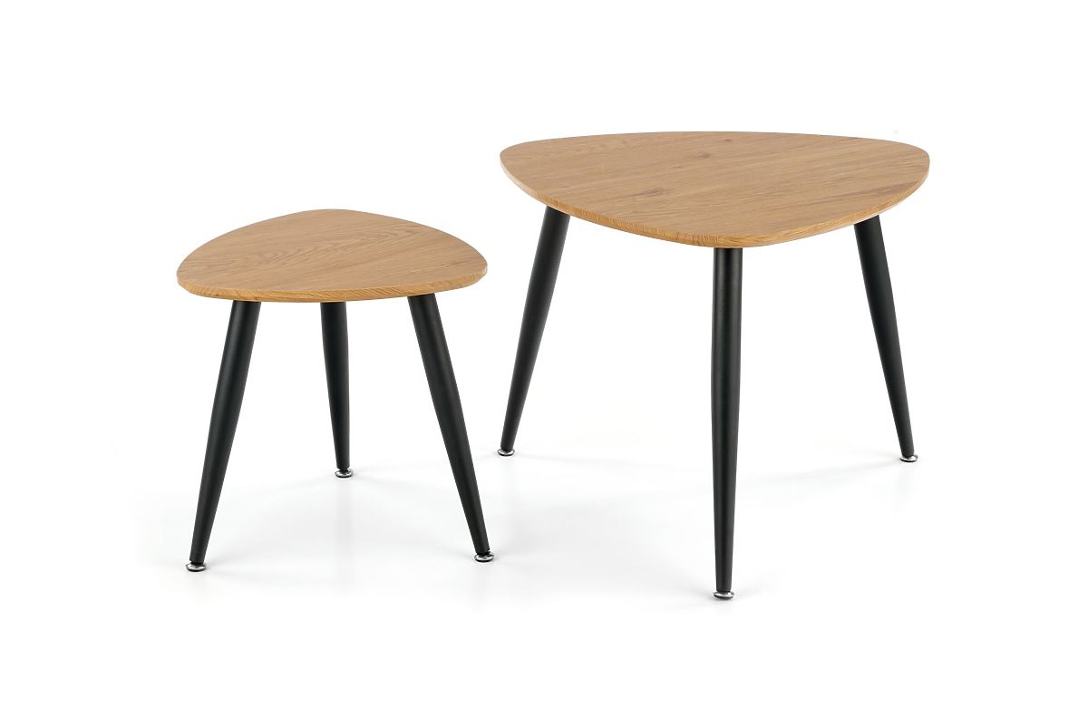 Stabilnost zagotavljajo tri jeklene noge s črnim prašnim premazom, ki se proti dnu rahlo zožijo in mizicam dajejo lahek in moderen videz. Ovalne plošče iz furnirane MDF z vidno naravno teksturo poudarjajo brezčasen značaj celotne sestave.