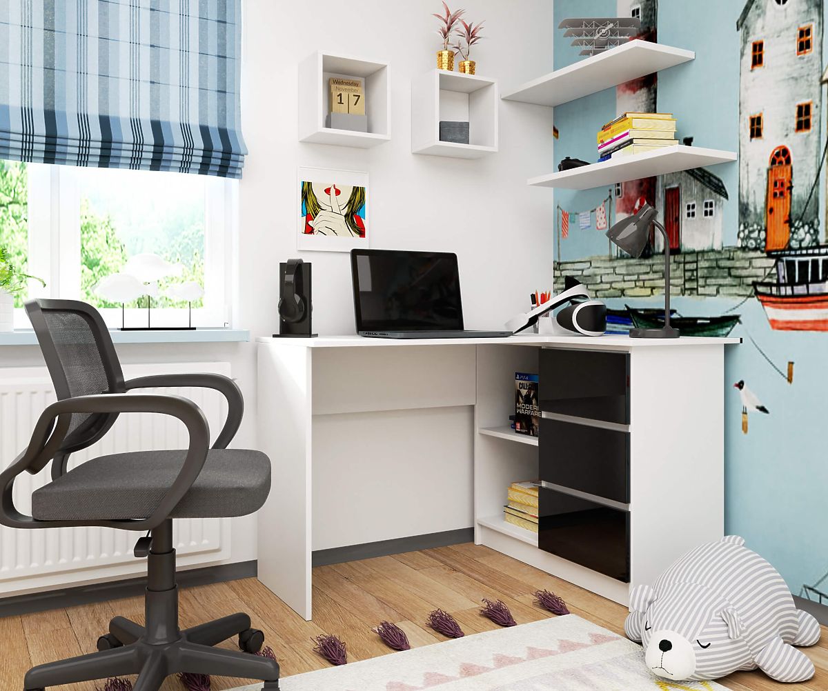 Za igralce, študente, ki iščejo prostor za študij, in odrasle, ki delajo od doma, je priporočljiva udobna računalniška miza s tremi predali. Konstrukcija pohištva je izdelana iz laminirane plošče debeline 16 mm, ki je zelo odporna proti obrabi. Čelne površine vrat so izdelane v akrilni tehnologiji, kar pomeni, da imajo najvišji standard sijaja med podobnim pohištvom. Zaradi prilagojenih dimenzij ima miza veliko kapaciteto za shranjevanje dodatnih dodatkov. Sistemi predalov so nameščeni na kovinskih valjčnih vodilih, ki se med delom ne zataknejo. Poleg tega so robovi mize zaščiteni z ABS robom, ki povečuje njihovo odpornost in odpornost proti mehanskim poškodbam. Proizvajalec ponuja pohištvo v različici za samostojno montažo, k naročenemu blagu je priložena jasna montažna navodila. Garancijska doba za naročeno kotno mizo je 24 mesecev od nakupa.
