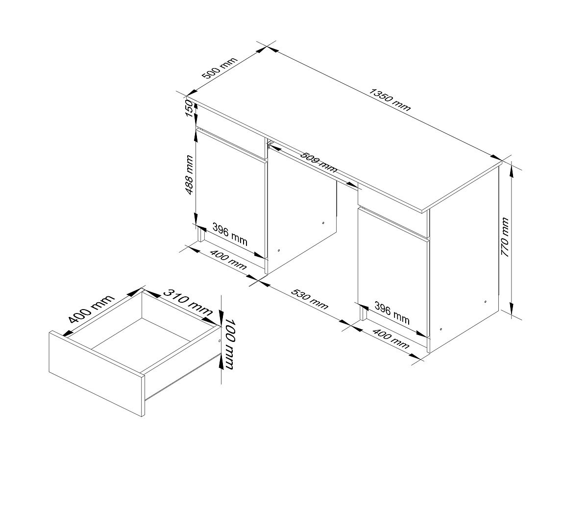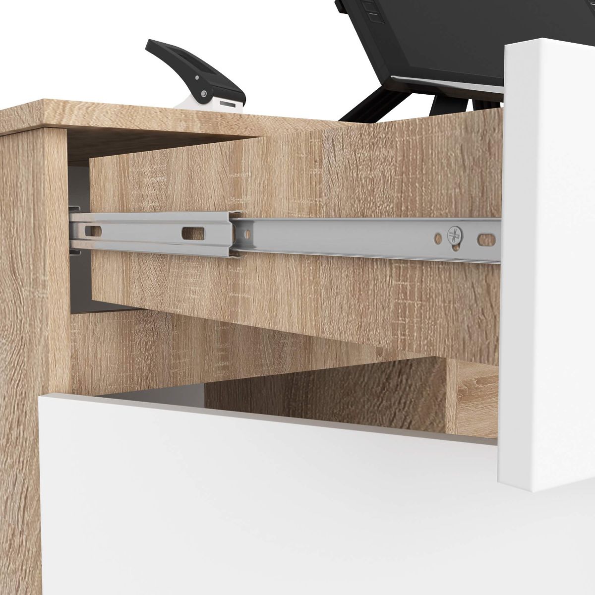 Računalniška miza A5 dolžine 135 centimetrov, ki združuje dve modni barvi (hrast sonoma in bela), je namenjena tako tistim, ki opremljajo pisarno, kot za domačo delovno sobo, otroško ali študentsko sobo.