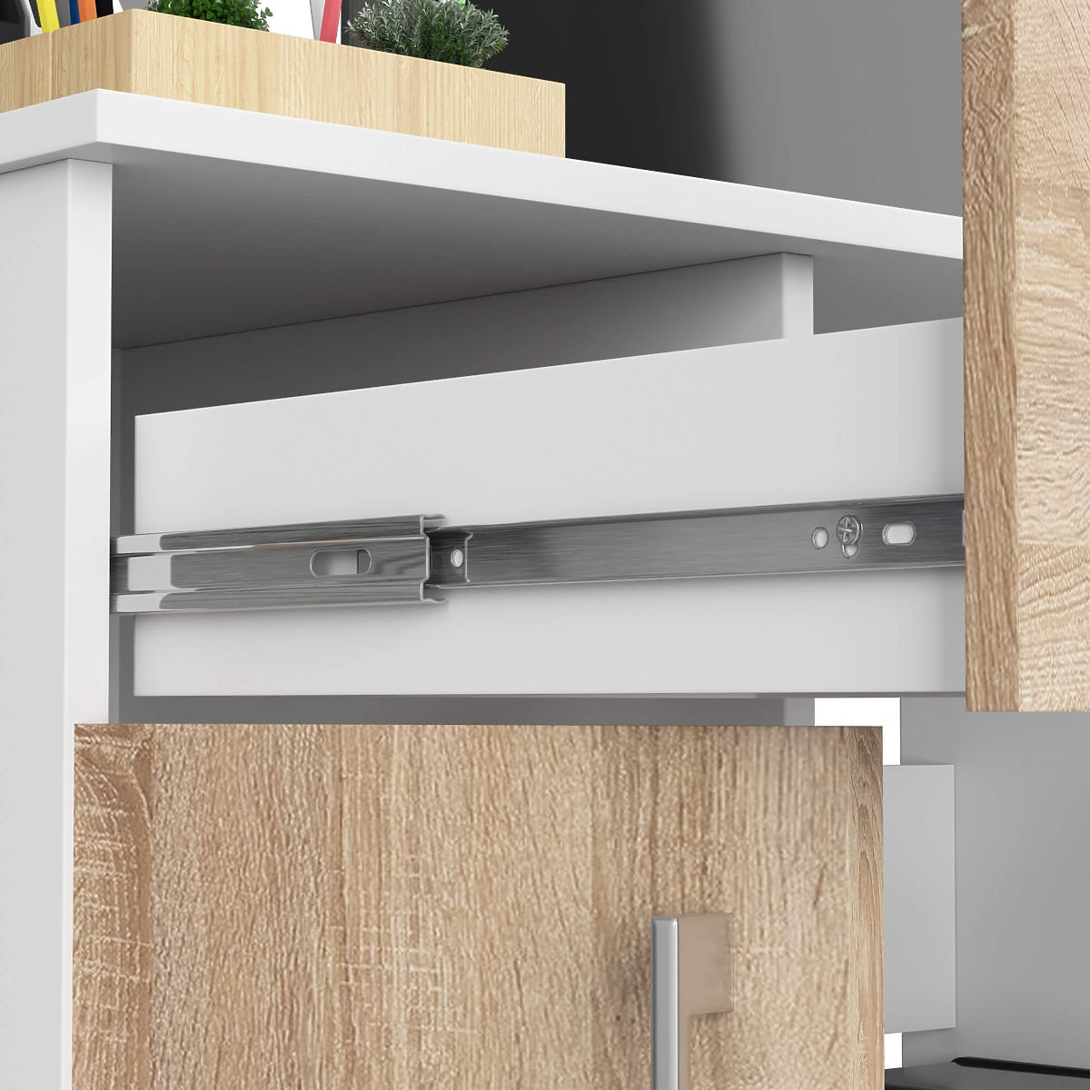 Računalniška miza JAY bela/sonoma je univerzalno in brezčasno pohištvo. Primerna je ne le za majhne, udobne pisarniške prostore, ampak tudi za bivalne prostore. Ohranjanje udobnih dimenzij in hkrati velike količine prostora za shranjevanje se izkaže ne le v otroški in študentski sobi, ampak tudi v spalnici ali dnevni sobi, še posebej, če je treba ustvariti dodatno računalniško delovno mesto, npr. za delo ali študij na daljavo.