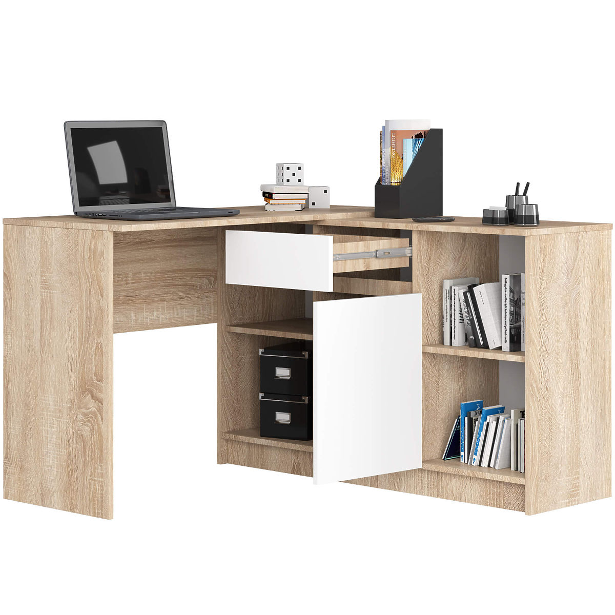 Set B-17 komoda in pisalna miza je izjemno funkcionalen. Njegova konstrukcija omogoča montažo tako na desni kot na levi strani. Tako ga je mogoče prilagoditi prostoru, ki ga imate na voljo. Set bo primeren za pisarno, vključno z domačo, ali za študentsko sobo. Združitev mize in komode v celoto omogoča boljšo izrabo prostora. Police lahko sprejmejo fascikle, pisarniške in pisalne potrebščine ali knjige. Na voljo je tudi predal za drobne pripomočke. Tako bo vse potrebno med delom ali študijem na dosegu roke.