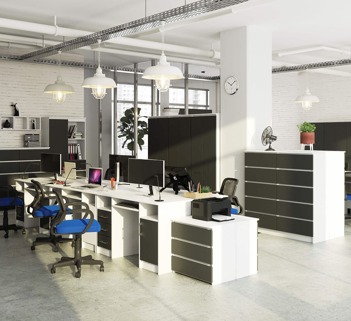 Računalniška miza ANA 124 cm se zaradi klasične kombinacije bele in grafitno sive barve zlahka prilega vsakemu interierju. Zasnovana je bila z mislijo na pisarniške prostore in delovne sobe. Primerna je tudi za sobo najstnika. Na plošči mize je veliko prostora – lahko postavite monitor in druge potrebne delovne predmete po potrebi. Za tipkovnico je na voljo ločena izvlečna polica. Miza ponuja veliko prostora za poljubno razporeditev: dve niši, trije predali in omarica s polico. Celotna konstrukcija je izdelana iz laminirane plošče, ki je enostavna za vzdrževanje in odporna proti obrabi. Miza ANA je eleganca, funkcionalnost in trdnost v enem.