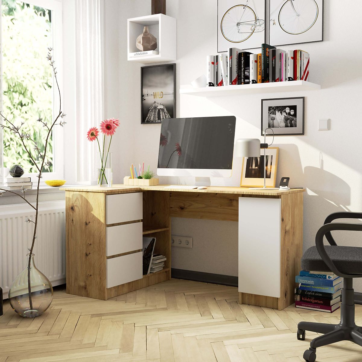 Kotna pisalna miza B20 155 cm LEVA v barvi Hrast Artisan z belimi čelnimi površinami je eleganten pisarniški pohištvo z modernim dizajnom. Bo odlična izbira za domače pisarne in otroške sobe. Kotna miza se bo vključila v ureditev prostora in ustvarila primeren prostor za delo in študij. Zahvaljujoč predalom, policam in omarici, nameščenim na obeh straneh mize, bodo potrebni predmeti na dosegu roke. Enostavno bomo uredili tudi dokumente, knjige ali pisarniške potrebščine, ki jih bodo sprejeli prostorni predali na kolesnih vodilih. Miza je izdelana iz laminirane plošče debeline 16 mm znamke Kronospan, ki je odporna proti obrabi, kar zagotavlja dolgo življenjsko dobo mize. Robovi pohištva so oblepljeni z ABS robom, ki zagotavlja odpornost proti mehanskim poškodbam mize.