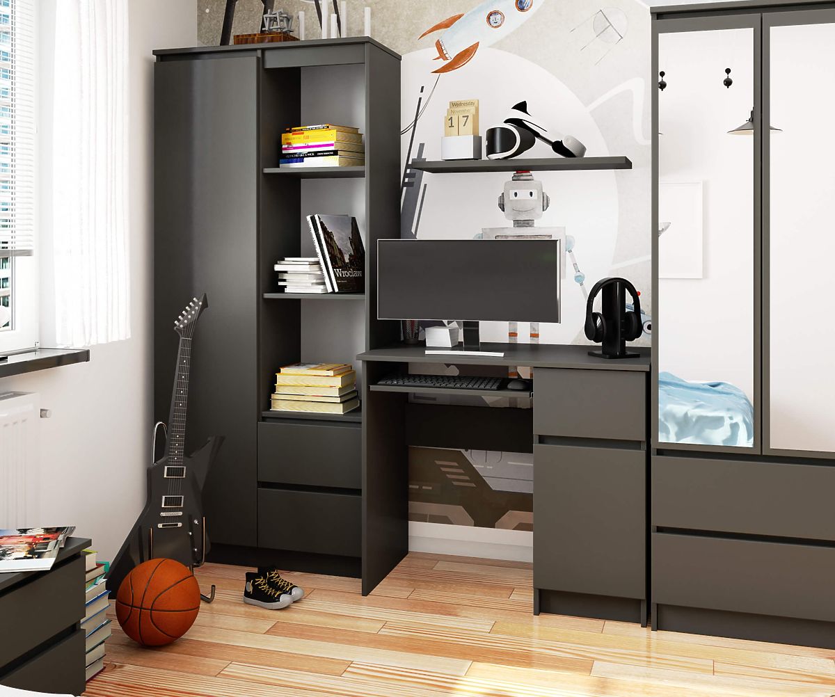 Samostoječa miza PIKSEL 90 cm v barvi GRAFIT SIVA je idealna rešitev za majhne prostore. Odlično služi kot šolska ali računalniška miza. Njena ergonomska zasnova zagotavlja udobje pri uporabi. Miza je opremljena z izvlečno polico za tipkovnico, praktičnim stranskim predalom in omarico s polico, v katero se zlahka prilegajo mape in knjige. Za izdelavo mize je bila uporabljena prijetna na dotik in enostavna za vzdrževanje mat plošča, prekrita z odporno laminatno plastjo. Celoto dopolnjujejo praktični ročaji v srebrni barvi.