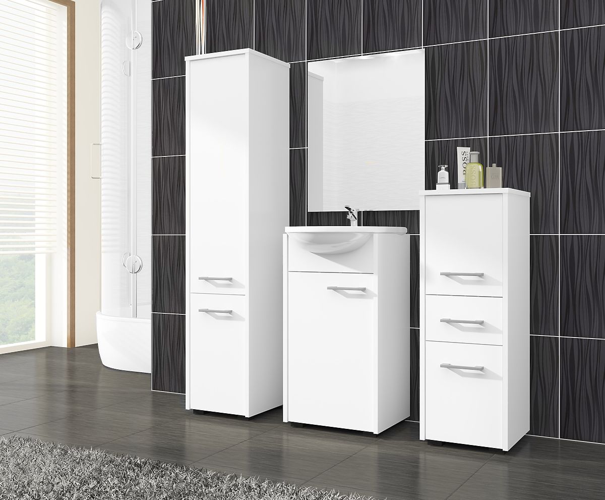 Belo pohištvo se vedno odlično prilega kopalnicam. Zato je kopalniški stolpec v tem odtenku odlična izbira tako za manjše kot večje prostore. Naš ponujeni stolpec je dvovratni model. Ima večja zgornja in manjša spodnja vrata. Na njih so elegantni, privlačni ročaji za odpiranje. Za temi vrati je nameščen funkcionalen regal. V zgornjem delu stolpca lahko shranimo predmete, kot so pralni praški, tekočine ali brisače. Spodnji del omarice je idealen prostor za majhne dodatke in kozmetiko. Elegantna bela barva osvetli vsak interier in se odlično ujema z barvo ploščic ali drugega pohištva. Optimalna širina in globina omarice zagotavljata, da ne bo ovirala gibanja po kopalnici in uporabe tamkajšnjih naprav. Konstrukcija omarice je izdelana iz izjemno kakovostne laminirane plošče. Zato je odporna proti poškodbam in intenzivni uporabi. Robovi oblepljeni z ABS materialom zagotavljajo estetski videz tega pohištva ves čas njegove uporabe.