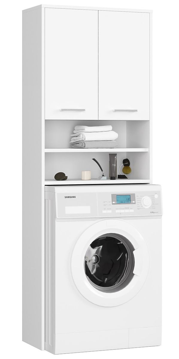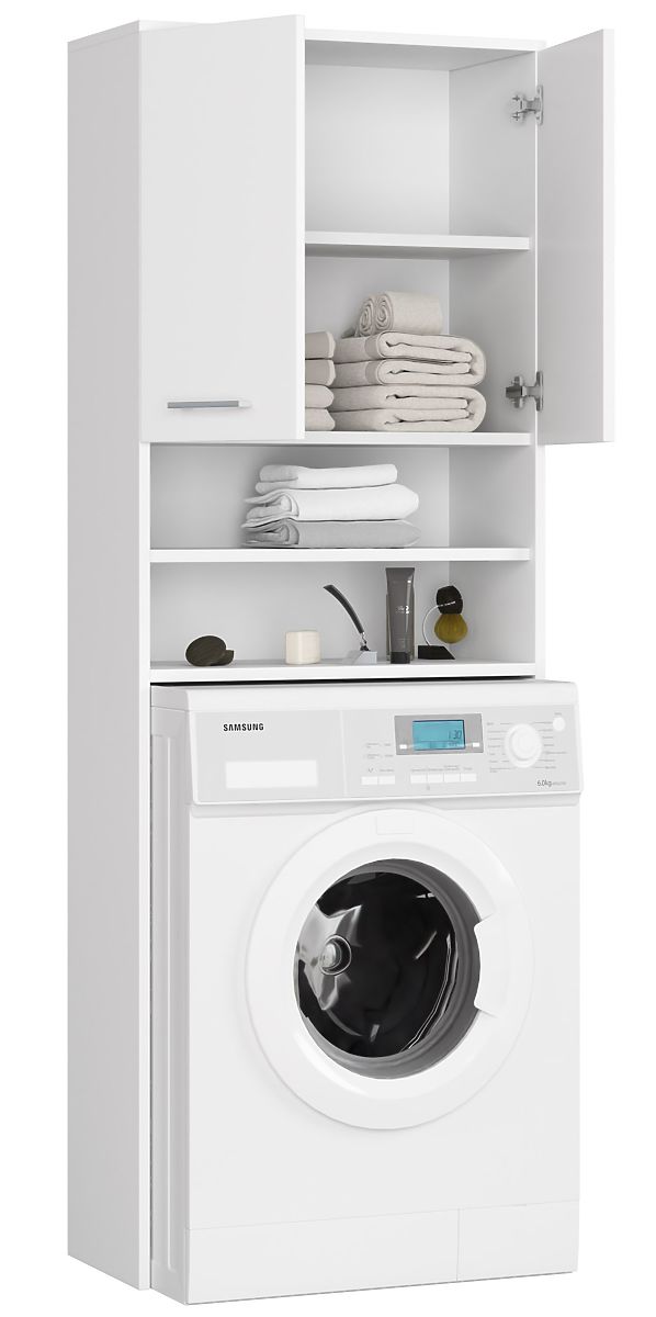 Regal nad pralni stroj z belimi vrati in policami za shranjevanje. .. več