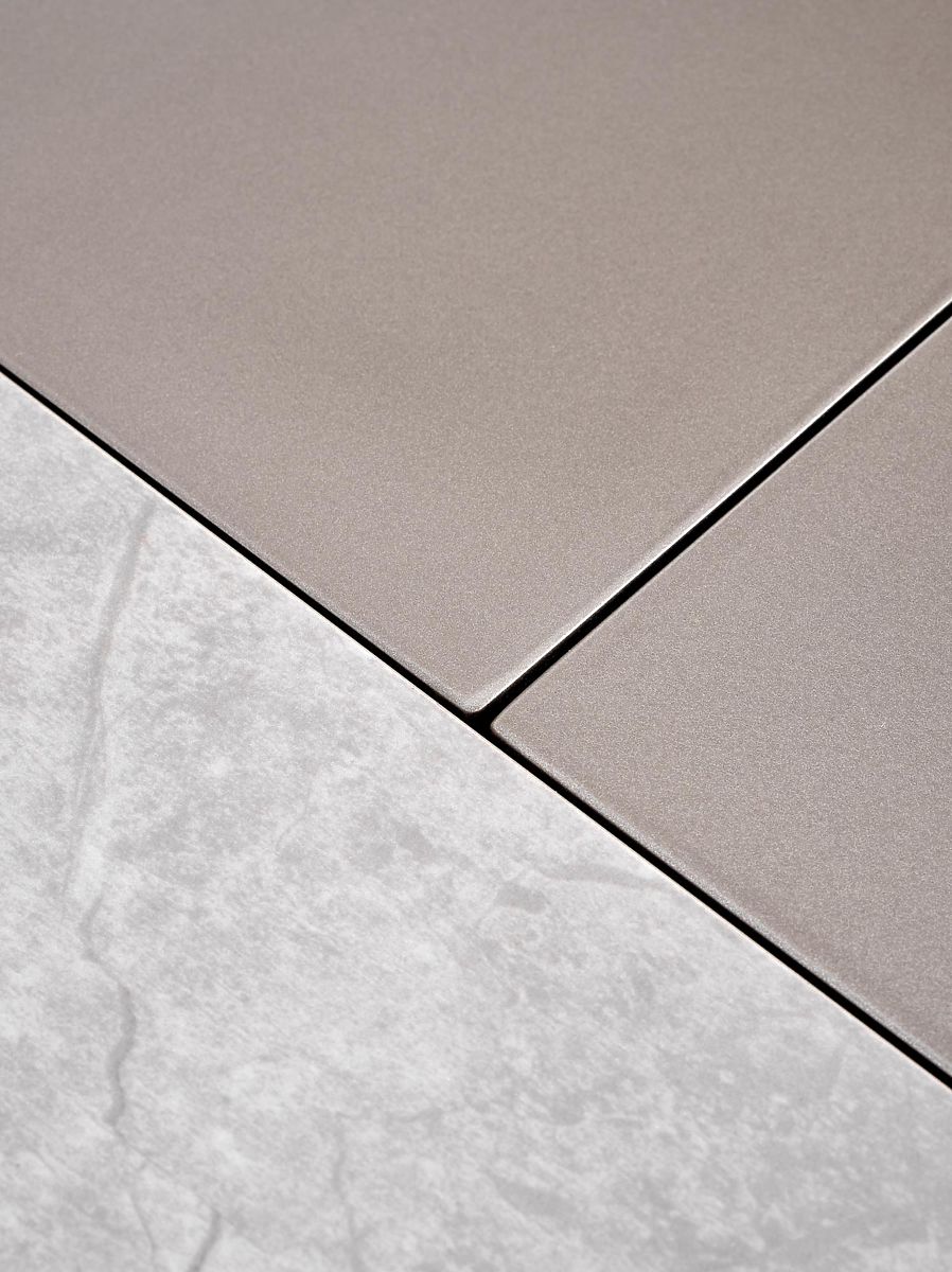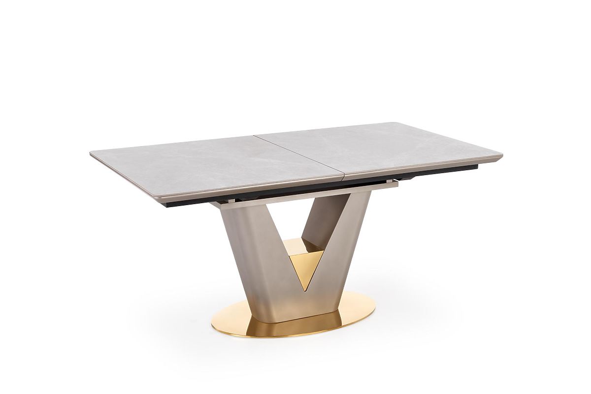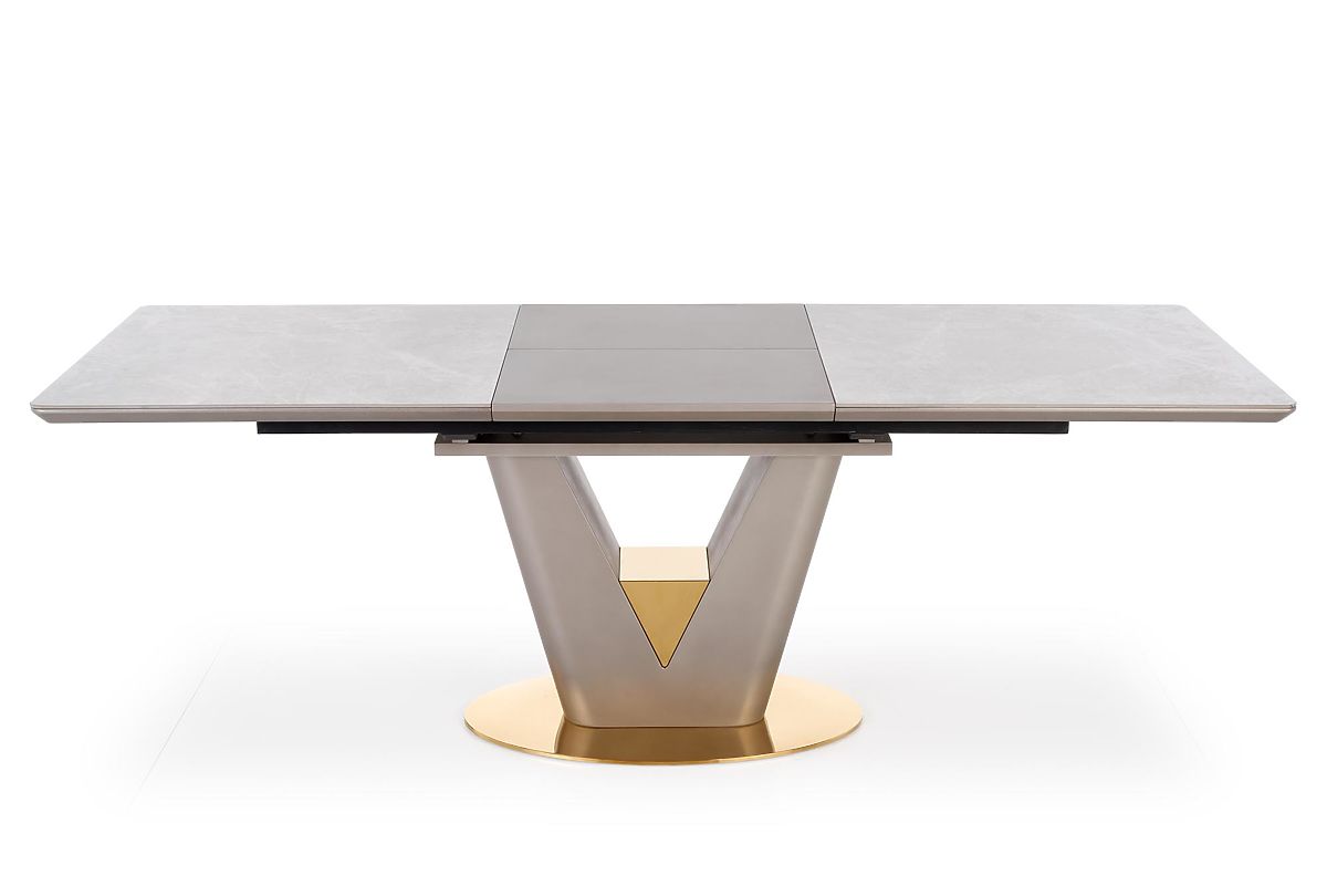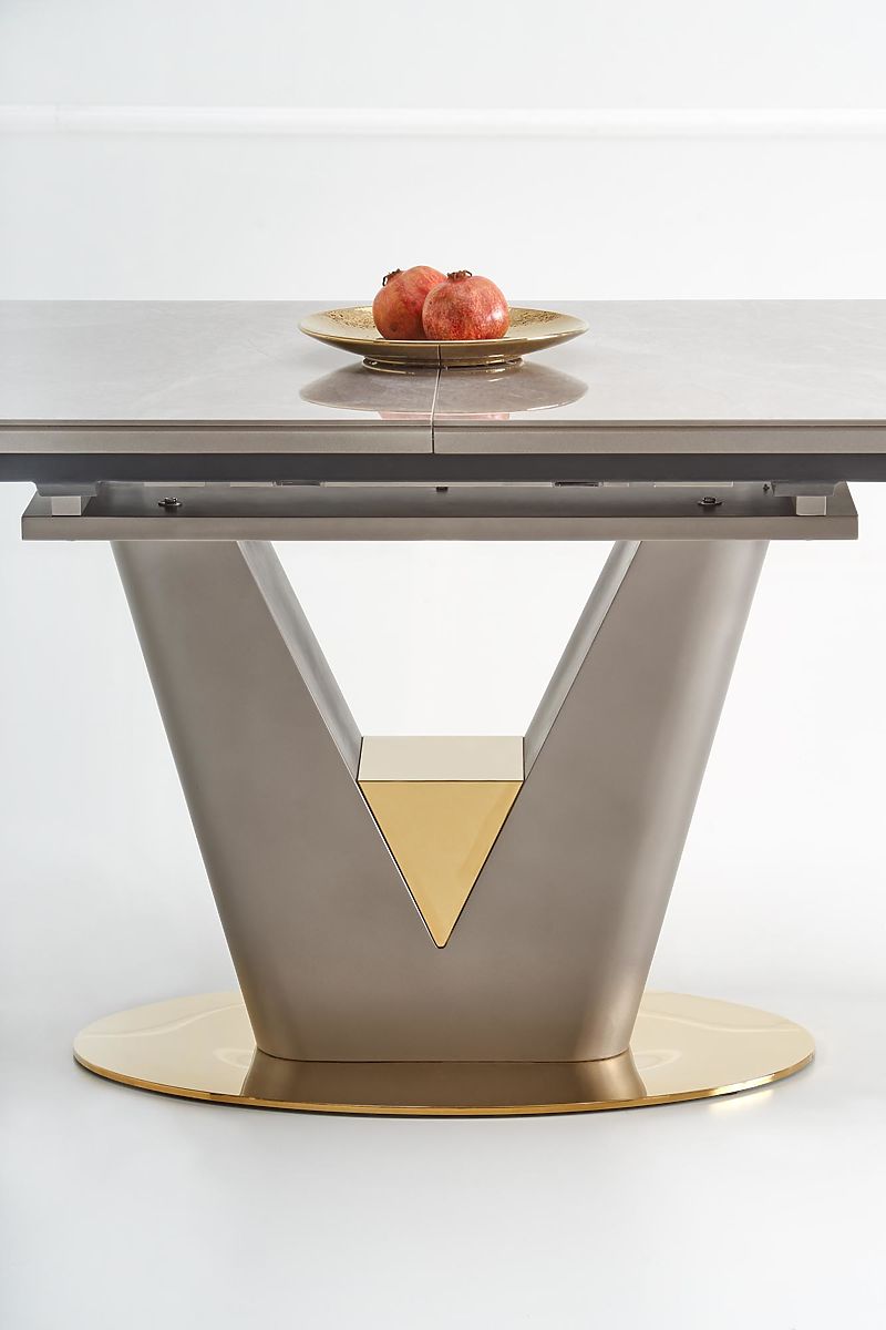Raztegljiva jedilna miza VALENTINO znamke Halmar je utelešenje moderne elegance, luksuza in funkcionalnosti. Zaradi svojega ekskluzivnega dizajna bo postala osrednji element vsake jedilnice ali kuhinje, opremljene v modernem, glamuroznem ali reprezentativnem slogu. Pravokotna mizna plošča z zaobljenimi vogali in poševnimi robovi je izdelana iz kakovostne MDF plošče, prevlečene s svetlo sivo marmorno folijo, ki mizi daje prefinjen in brezčasen videz. Praktična prednost je raztegljiv mehanizem, s katerim je mizo mogoče enostavno podaljšati – po raztegu je površina dopolnjena z dvema keramičnima ploščama, lakiranima v sivem odtenku. Miza tako udobno ponuja prostor za do 8 oseb. Stabilnost zagotavlja masivno jekleno podnožje v obliki črke V, ki je v spodnjem delu okrašeno z zlatim klinom. Zlati poudarki se ponavljajo tudi na ovalni osnovi mize in skupaj s sivim izvedbo ustvarjajo luksuzen in harmoničen kontrast. Miza VALENTINO je idealna izbira za tiste, ki iščejo dizajnersko, trdno in praktično jedilno mizo, ki se prilagaja vsakodnevnemu življenju in slavnostnim priložnostim.