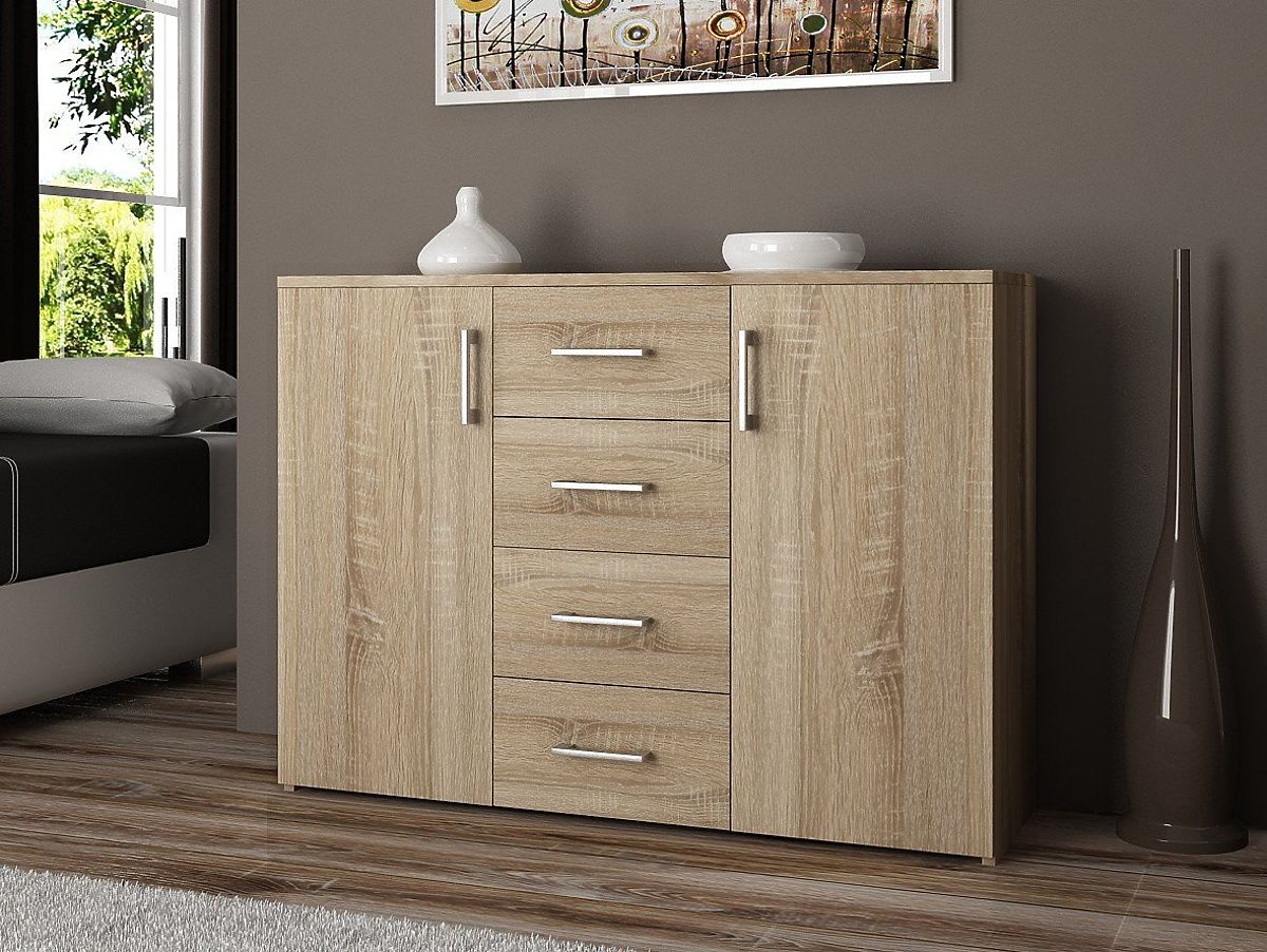 Komoda za dnevno sobo, spalnico ali celo predsobo, izdelana iz laminirane plošče, odporne proti obrabi. Namestitev je odvisna od uporabnikovih preferenc in dokončanja notranjosti. V tej ponudbi priporočamo model v barvi Hrast Sonoma. Svetla barva bo izpolnila pričakovanja vseh lastnikov svetlih, prostorskih in modernih notranjosti. Komoda je v celoti izdelana iz laminirane plošče debeline 16 milimetrov. To zagotavlja dolgo in brezskrbno življenjsko dobo!