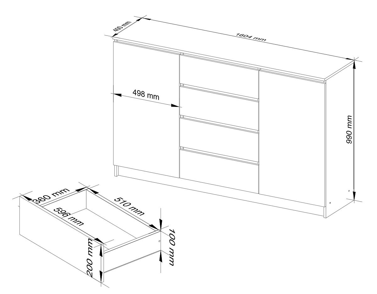 Velika komoda K 160 cm je pohištvo, ki je zelo udobno za uporabo in ima izjemne praktične lastnosti. Uporabnikom ponuja kar 4 prostorne predale in dve globoki polici, skriti za vrati. Zaradi takšnih konstrukcijskih rešitev je veliko prostora za shranjevanje različnih oblačil, kot so oblačila in čevlji, ter drugih stvari, odvisno od potreb.