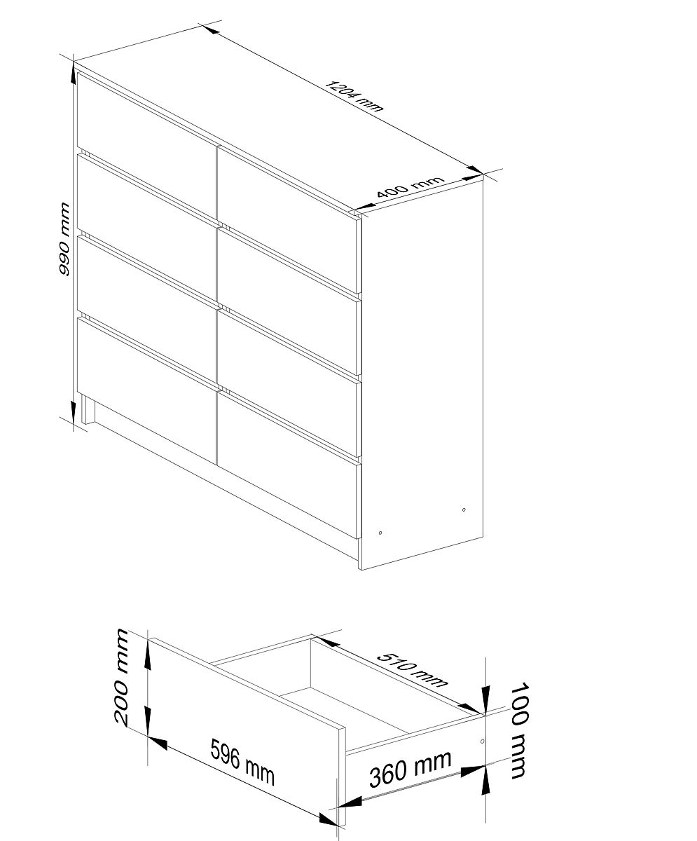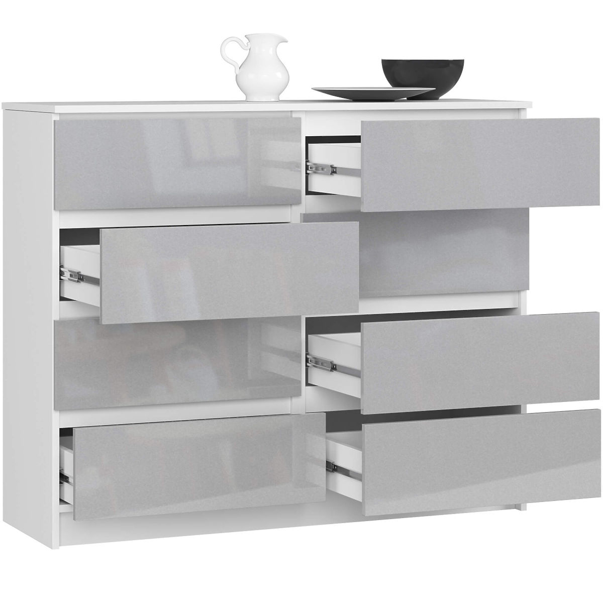 Ponujamo veliko komodo z 8 predali. Komoda ima belo polmat ohišje iz laminirane plošče debeline 16 mm, ki je zelo odporna na obrabo. Čela so izdelana iz MDF plošče z akrilnim premazom debeline 19 mm, ki se ponaša z visoko trpežnostjo in je odporna na bledenje zaradi intenzivne sončne svetlobe. Robovi so opremljeni z ABS robom, ki zagotavlja visoko zaščito pred mehanskimi poškodbami in obrabo. Predali brez ročajev imajo moderno barvo metalik z visokim sijajem. Predali so vodeni na kovinskih krogličnih vodilih. Komoda ima preprost in hkrati zelo univerzalen videz. Popolnoma se prilega vsakemu interierju, enako dobro bo videti v dnevni sobi, spalnici ali celo v pisarni. Zaradi zelo prostornih in obsežnih predalov bo v vsaki sobi red. K temu modelu komode se lahko uspešno ujema tudi drugo pohištvo iz serije CLP.