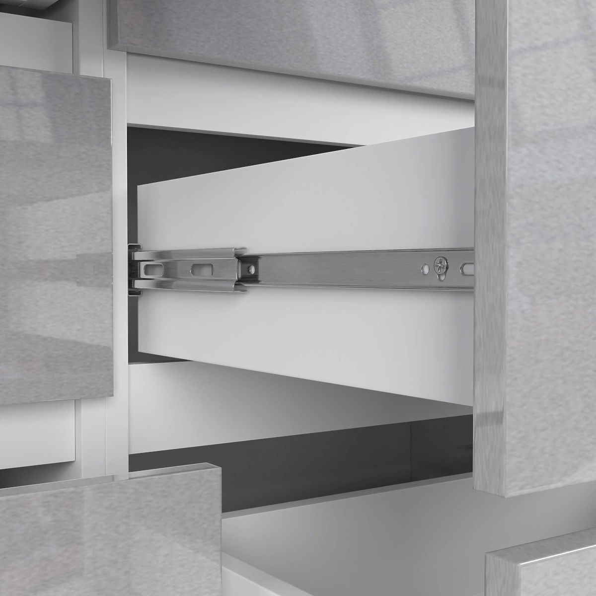Ohišje komode je izdelano iz laminirane plošče debeline 16 mm v polmat izvedbi, čela pa so iz plošče AKRIL debeline 19 mm v dekorju Metalik z visokim sijajem.
