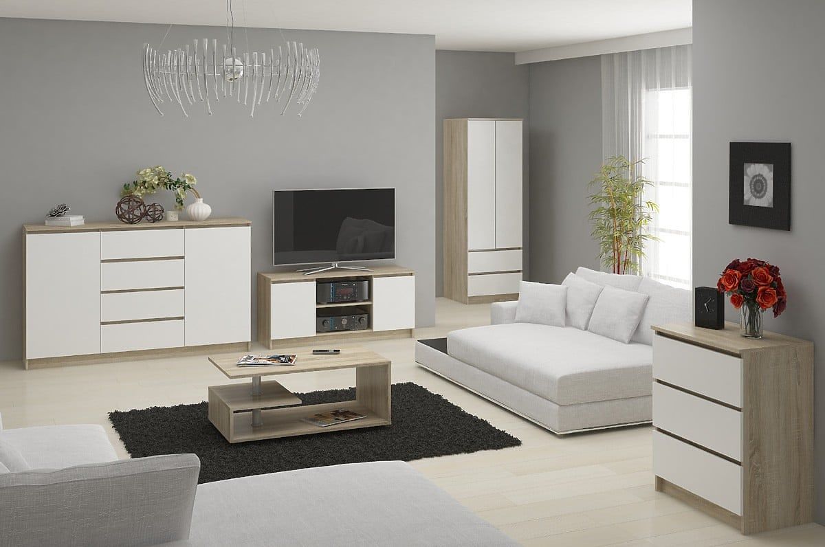 Komoda K 140 cm 3 vrata 3 predali se ponaša z modnimi barvami. Korpus je v barvi hrasta sonoma, ki je že leta zelo cenjen med uporabniki. Vzorec hrasta sonoma se odlikuje z izrazito vidnimi grčami in letnicami, kar mu daje videz naravnega lesa. Ima univerzalen značaj in bo odlično videti v večini prostorov. Čelne plošče so izvedene v klasični beli barvi.
