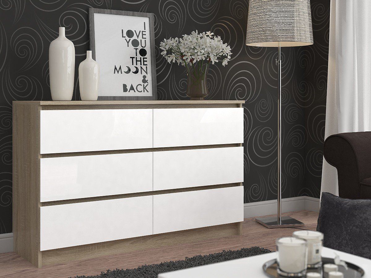 Elegantna, stilska in moderna. S temi tremi pridevniki lahko opišemo našo komodo. Dokončana v brezčasnih barvah. Korpus je v barvi sonoma, medtem ko so čela predalov bela. Ponudba, ki jo našim strankam ponujamo, ima dolžino 120 centimetrov, višino 77 centimetrov in globino 40 centimetrov. Prav zadnja dimenzija naredi našo pohištvo tako prostorno. Seveda šest predalov za različne dodatke, oblačila in čevlje tudi igra vlogo. Že omenjeni predali se premikajo nežno in natančno, vse zahvaljujoč kovinskim krogličnim vodilom.