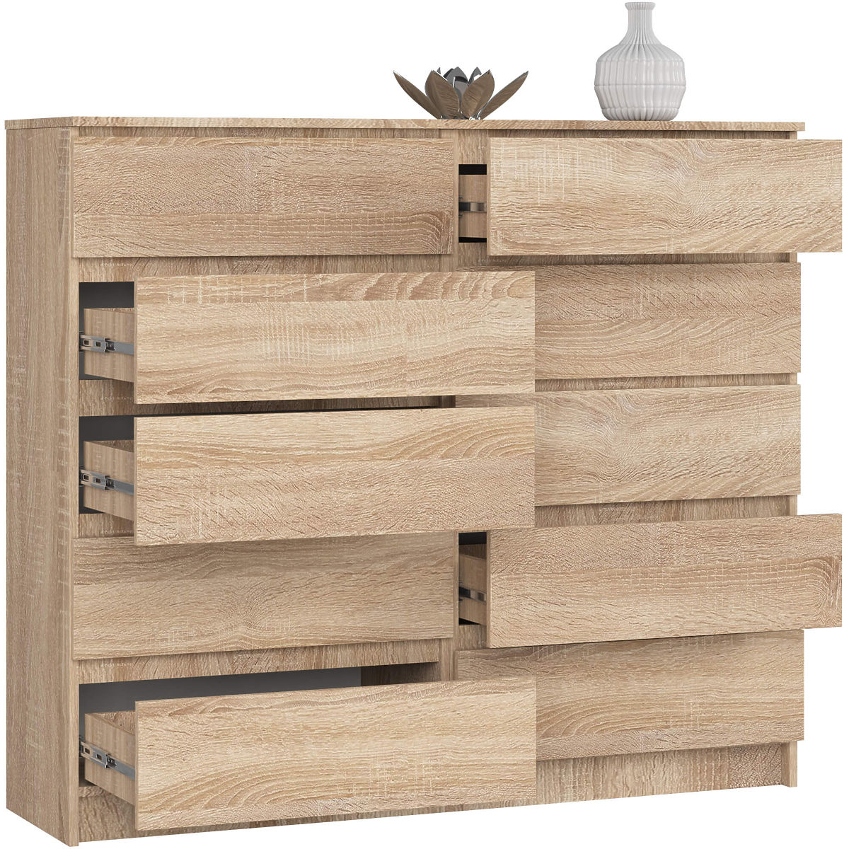 Trden pohištveni kos iz naše ponudbe je priljubljen med strankami, ki imajo raje klasični minimalizem. Predstavljena komoda K140 pritegne s preprosto obliko, univerzalno barvno shemo (hrast sonoma) in praktičnimi rešitvami. Osredotočamo se predvsem na kakovost, ponujamo pohištvo, izdelano iz trpežnih in kakovostnih materialov. Naš priporočeni model z desetimi predali se odlično prilega dnevni sobi, spalnici ali pisarni, pa tudi mnogim drugim prostorom, ki jih želite opremiti na moderen in funkcionalen način. Dobra kakovost po nizki ceni bo zagotovo razveselila ljubitelje sodobnih rešitev. Priporočamo tudi, da se seznanite z drugimi kosi pohištva iz te kolekcije - vse komode se odlikujejo po trdni izdelavi in trpežnih materialih, iz katerih so izdelane.