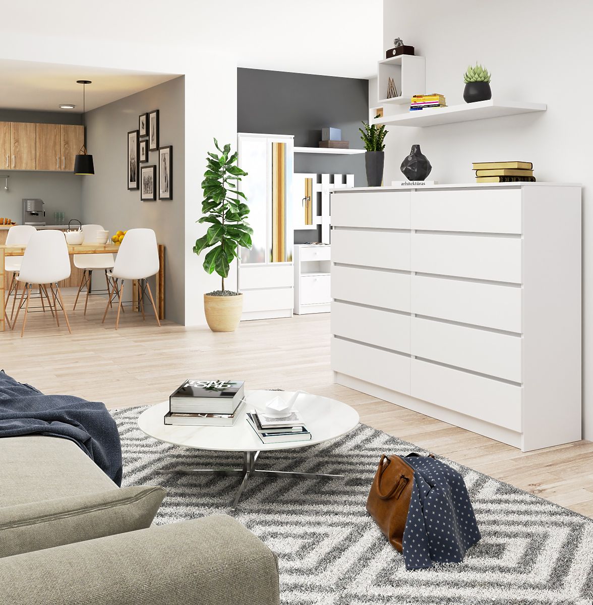Komoda z desetimi prostornimi predali v univerzalni beli barvi. .. več