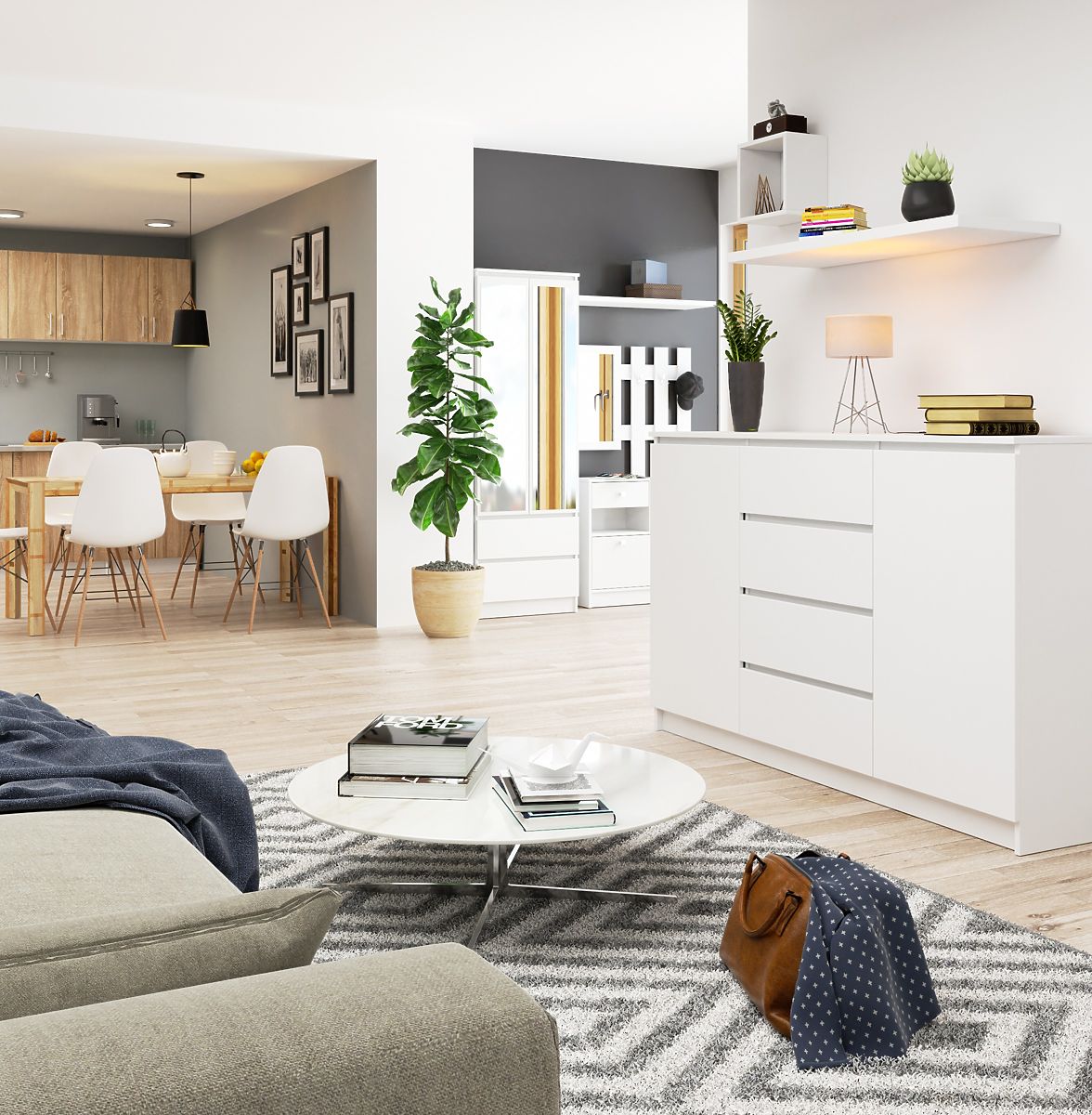 Komoda K160 je funkcionalno pohištvo, ki vsebuje veliko prostega prostora za uporabo. Je bele barve, kar jo naredi idealno izbiro za skandinavske in minimalistično opremljene interierje. Pohištvo je preprosto v obliki, kar mu daje veliko univerzalnost: lahko se postavi tako v stanovanje kot v pisarno. Komoda ima dolžino 160 cm in višino 99 cm. Globina je 40 cm. Izdelana je iz odporne laminirane plošče debeline 16 mm proizvajalca Kronospan. Poleg tega so njeni robovi oblepljeni z ABS robom, kar zagotavlja dodatno zaščito pred poškodbami. Pohištvo sestavljata dve omari, znotraj vsake je ena polica. Ima tudi 4 predale, ki se premikajo na kovinskih krogličnih vodilih. Pohištvo zagotavlja visoko udobje uporabe, je prostorno in funkcionalno.